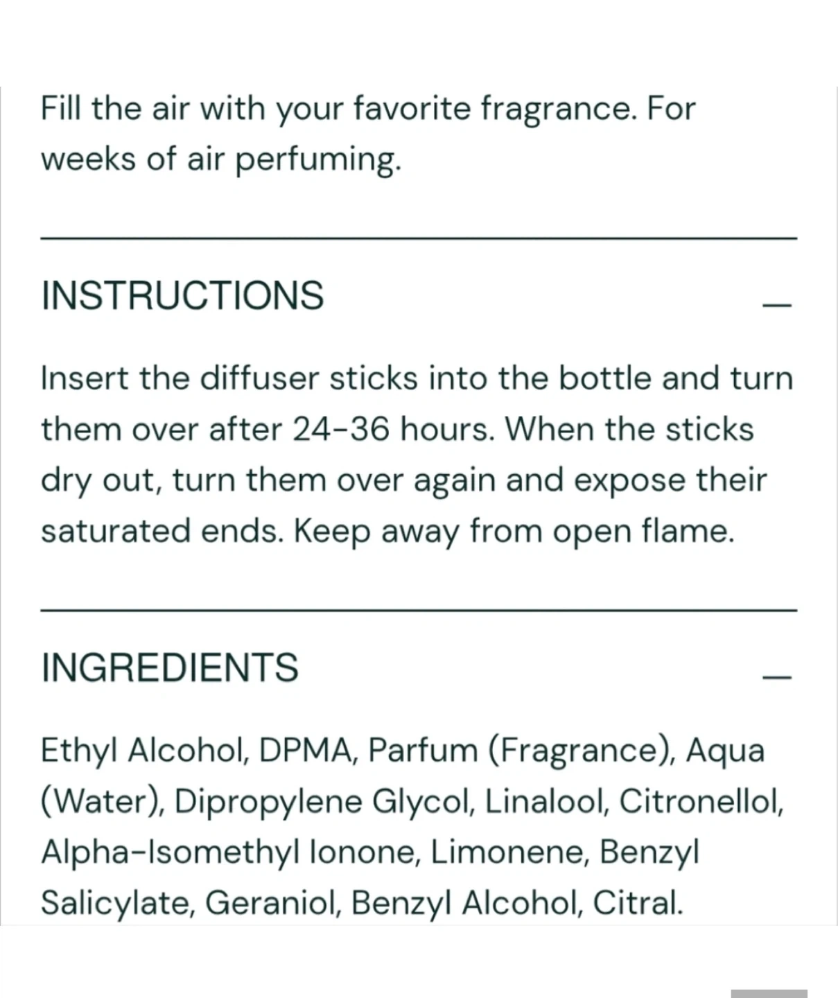 This diffuser comes with oil and sticks. It's designed to fill your space with fragrance. The bottle contains 200 ml of scent.
