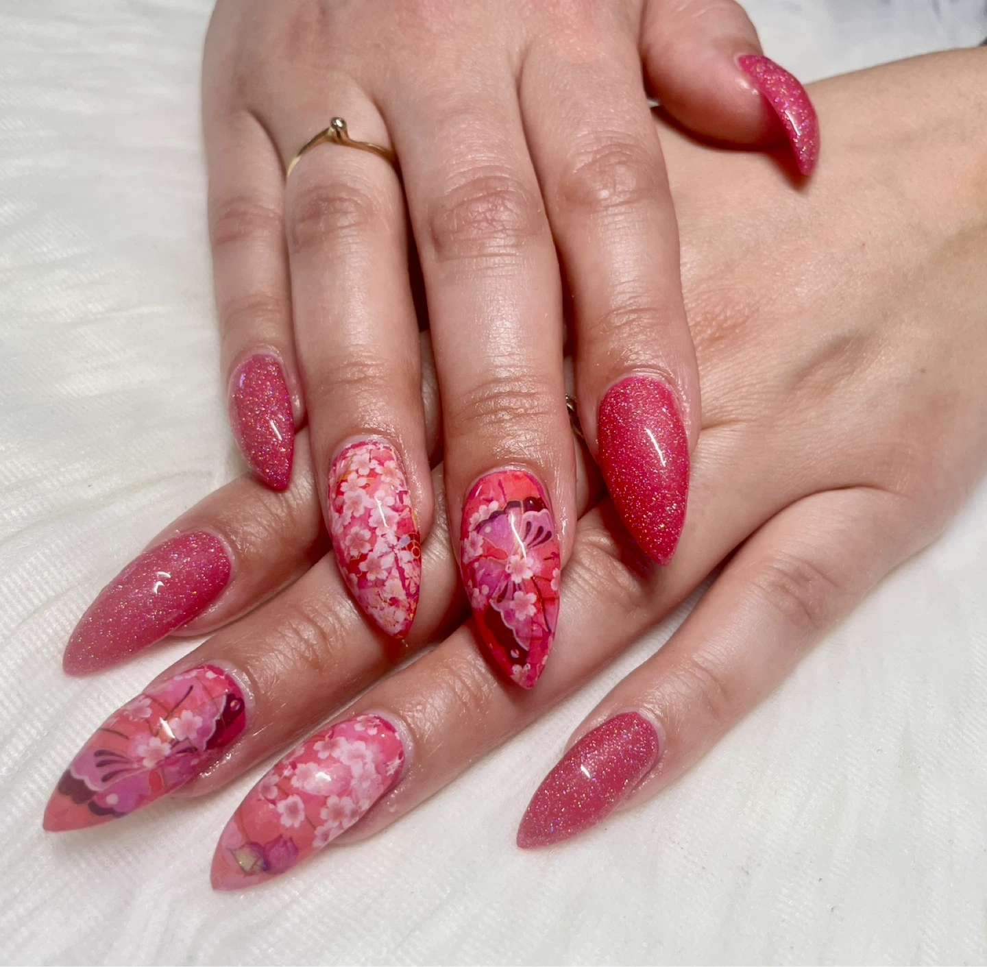 Custom Stiletto Nails - Pink Floral & Burgundy/Green Designs