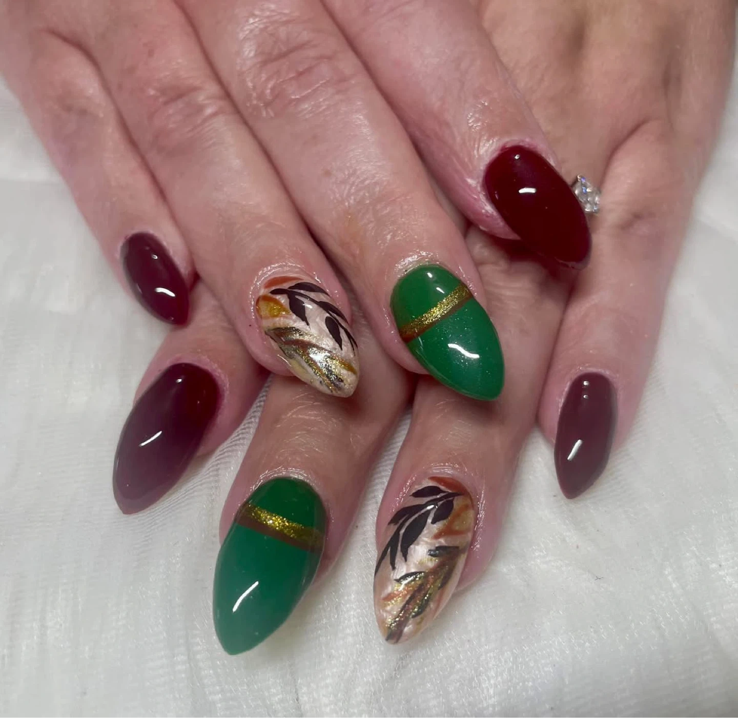 Custom stiletto-shaped nails featuring intricate pink floral designs with glitter accents on one set and a mix of deep burgundy and forest green with gold stripe and leaf art on the other. These are professionally applied Gel nails. Great for special occasions or a stylish everyday look!