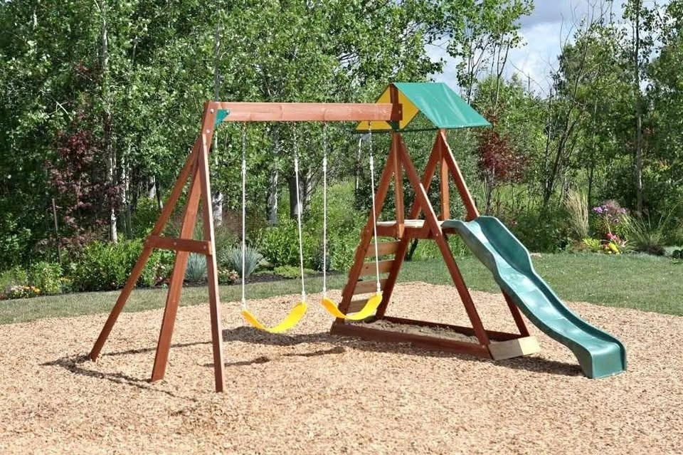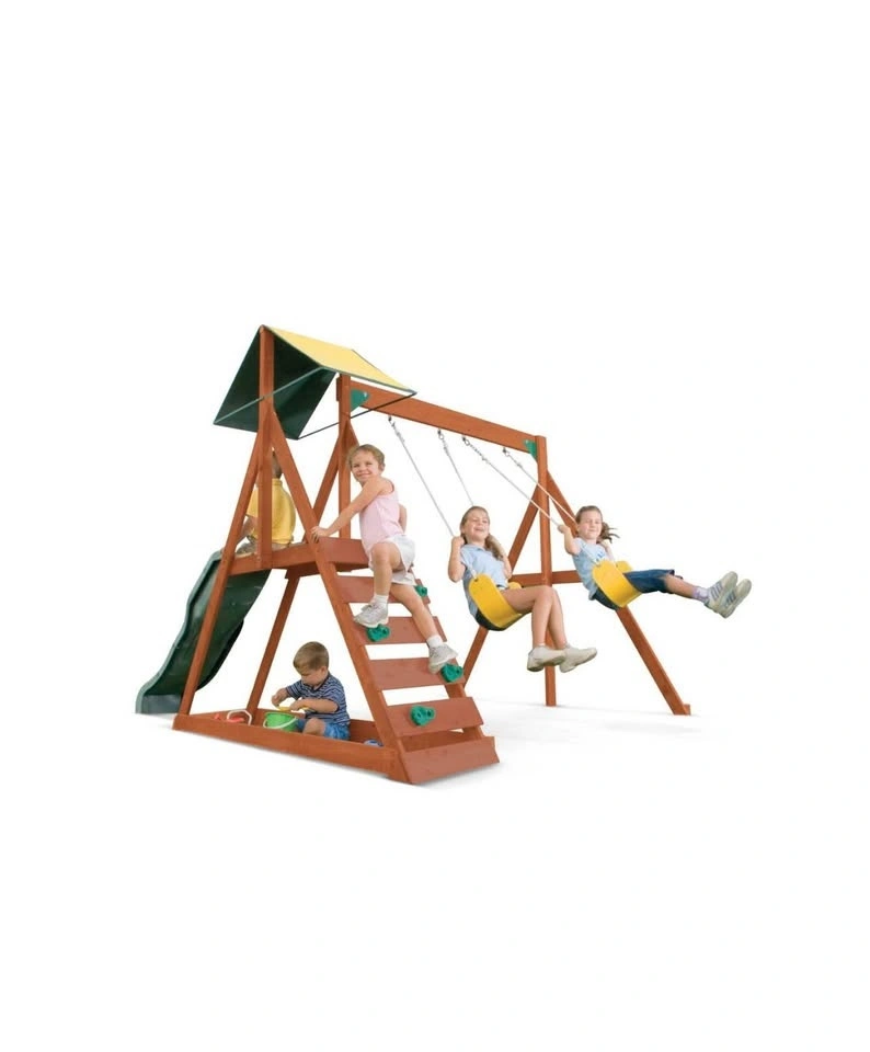Brand new in box. This KidKraft Sunview Wooden Play Centre will provide hours of backyard fun for kids. The play centre features a sandbox, rockwall, shaded play deck, 2 belt swings, and a high rail wave slide. It's made from 100% Cedar Lumber that is pre-cut, pre-drilled and pre-stained with a factory applied, child-safe stain. For use in residential areas only. Recommended for ages 3-10 years, intended for a maximum of 4 children with a weight limit of 110 lbs per child. Approximate building time for 2 people is 4-8 hours. Overall dimensions are 10' 10" L x 10' 10" W.