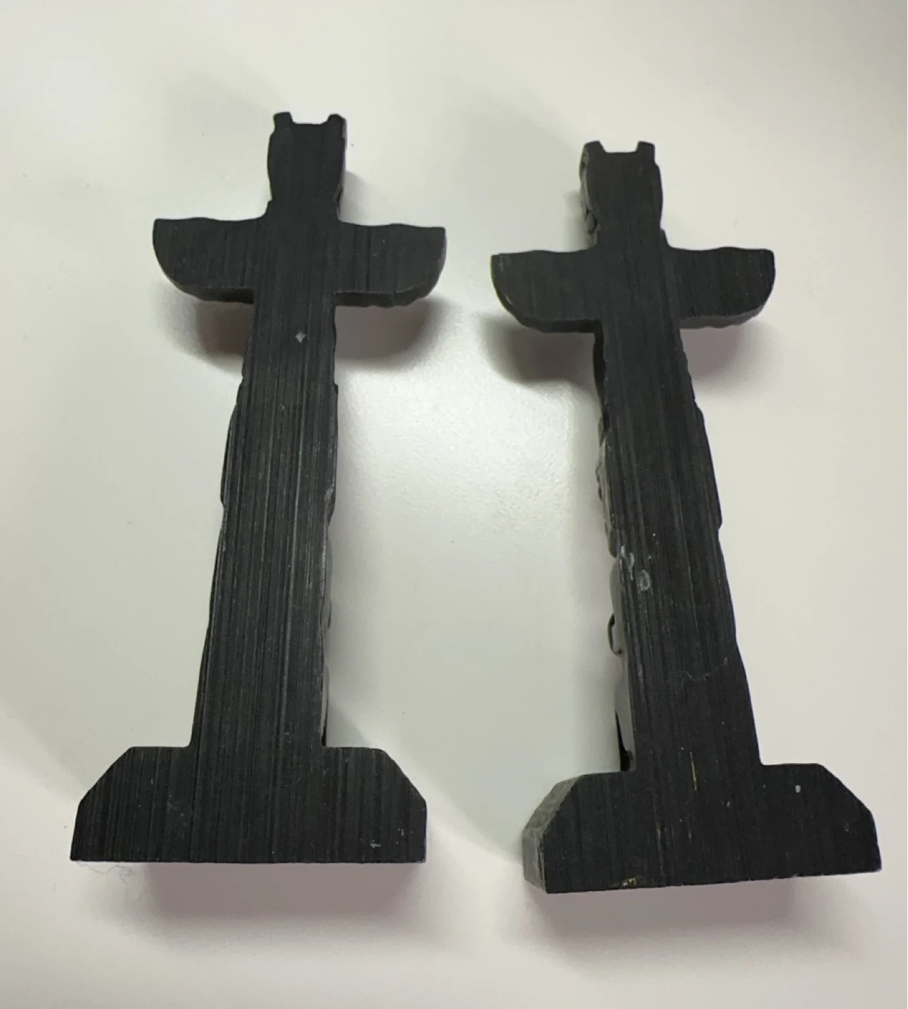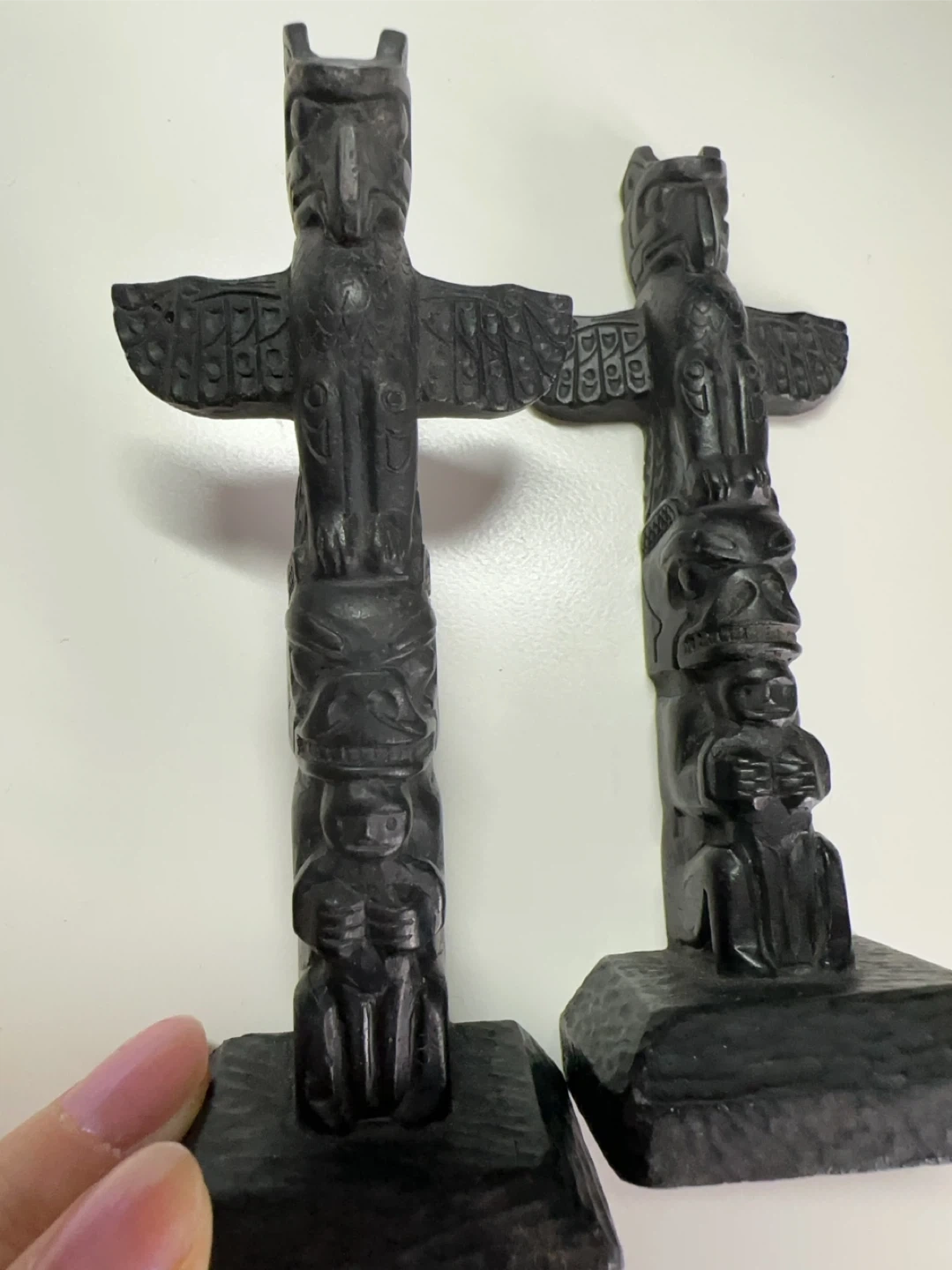 Two Black Wooden Totem Pole Figurines