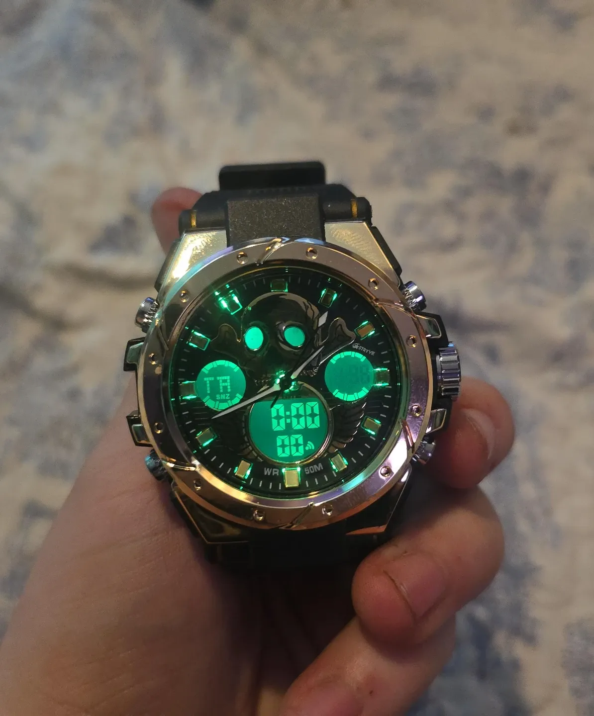 Cool Amuawa watch with a skull design on the face! It features a gold-tone accent and a digital display. The watch is in great condition and ready to wear