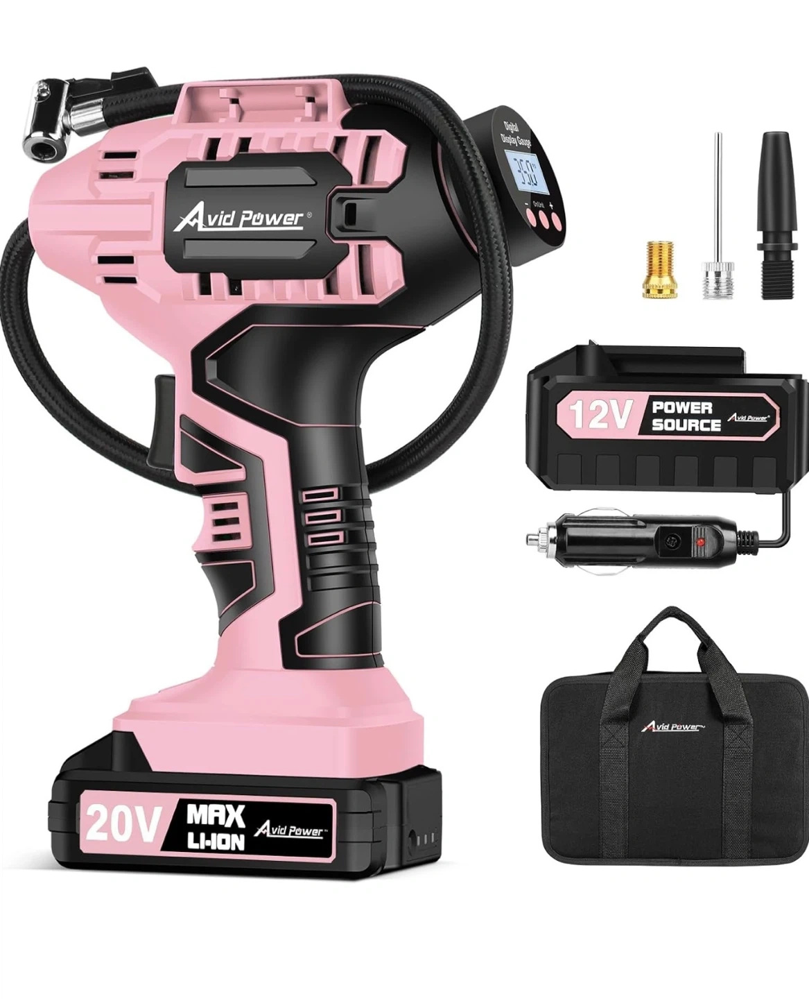 This pink Avid Power cordless tire inflator has a 20V MAX Li-ion battery. It features a digital display gauge for accurate pressure readings. Includes a 12V power source and storage bag. Useful for inflating car tires, bike tires, and sports balls.