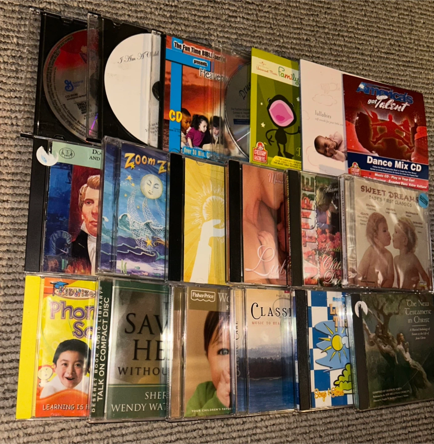 This lot includes 19 CDs covering various genres like lullabies, pop music, children's educational content, and religious themes. Titles include 'America's Got Talent Dance Mix CD', 'Sweet Dreams Baby's First Classics', and 'The New Testament in Christ'. These discs are suitable for learning and entertainment.