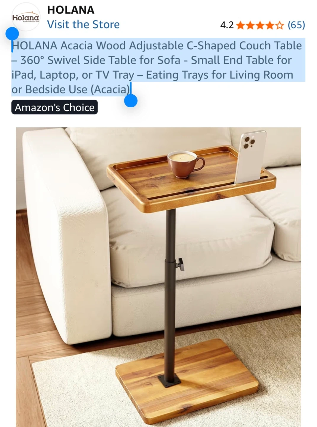 HOLANA Acacia Wood Adjustable C-Shaped Couch Table. Features a 360° swivel side table. Made with acacia wood in an acacia colour. Perfect for use as a small end table for a sofa, laptop tray, or eating tray.