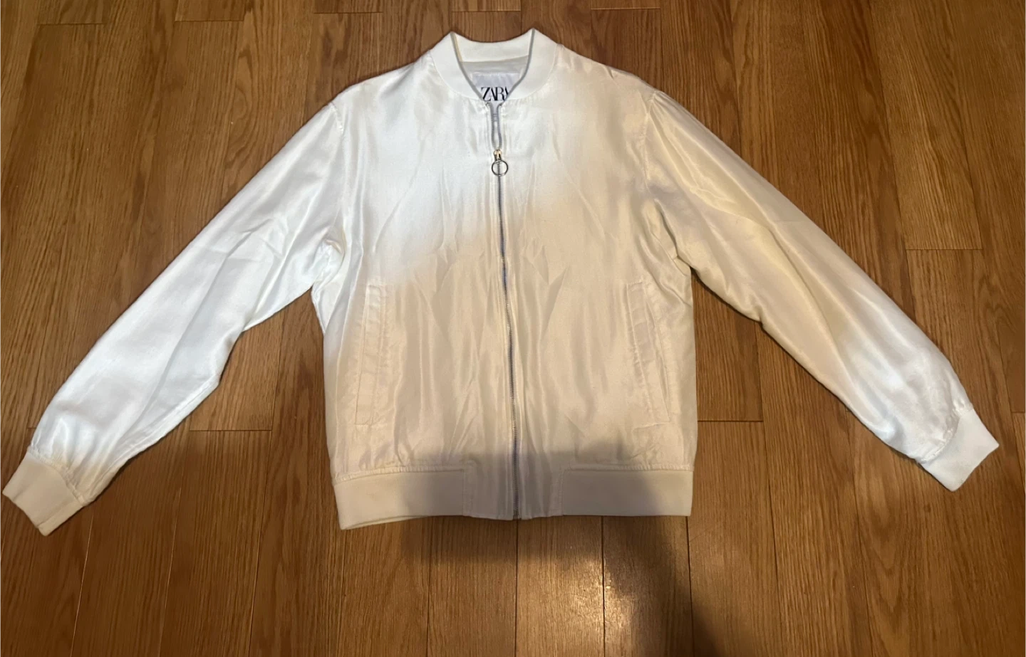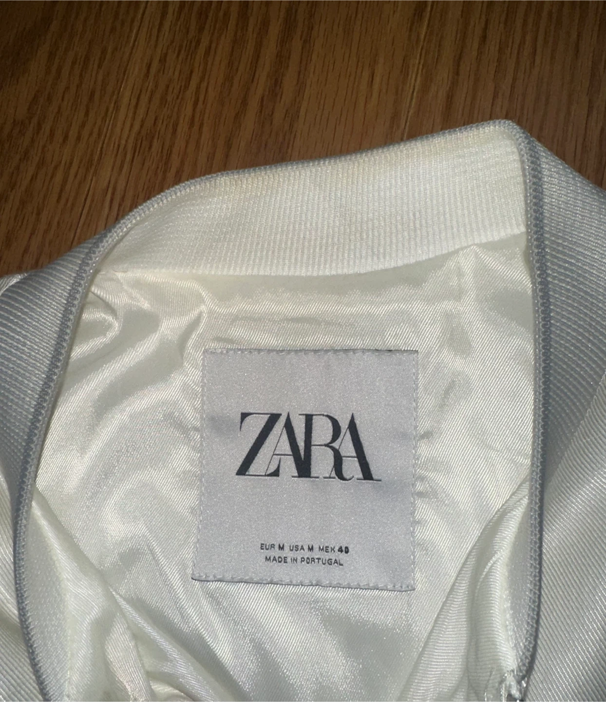 This is a white bomber jacket from Zara. It's a size medium with EUR M, USA M, and MEX 40 sizing. Made in Portugal. It features a zipper closure and ribbed cuffs and hem.