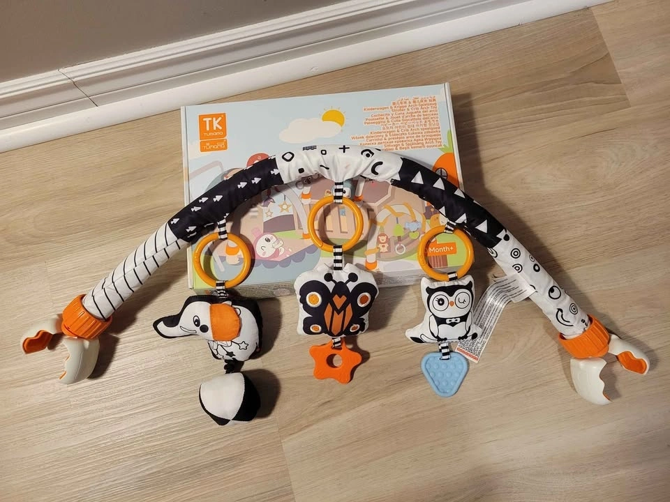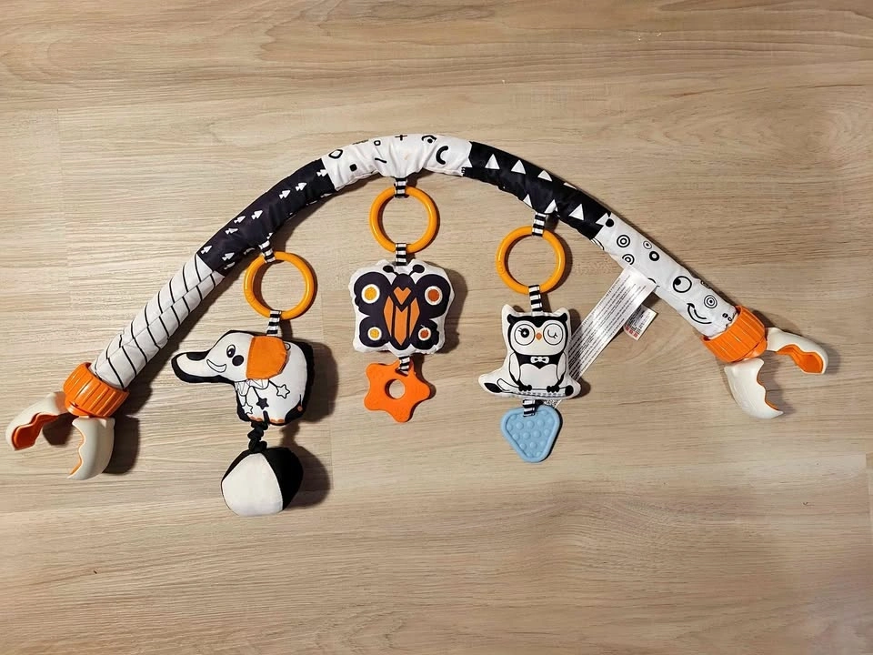 High-contrast (black/white) sensory arch (mobile) for strollers, car seats, or bouncers. Includes: 3 hanging toys with rattles and teethers. Condition: Like new, in original box. Brand: Tumama. Pickup: Orléans, K1C.