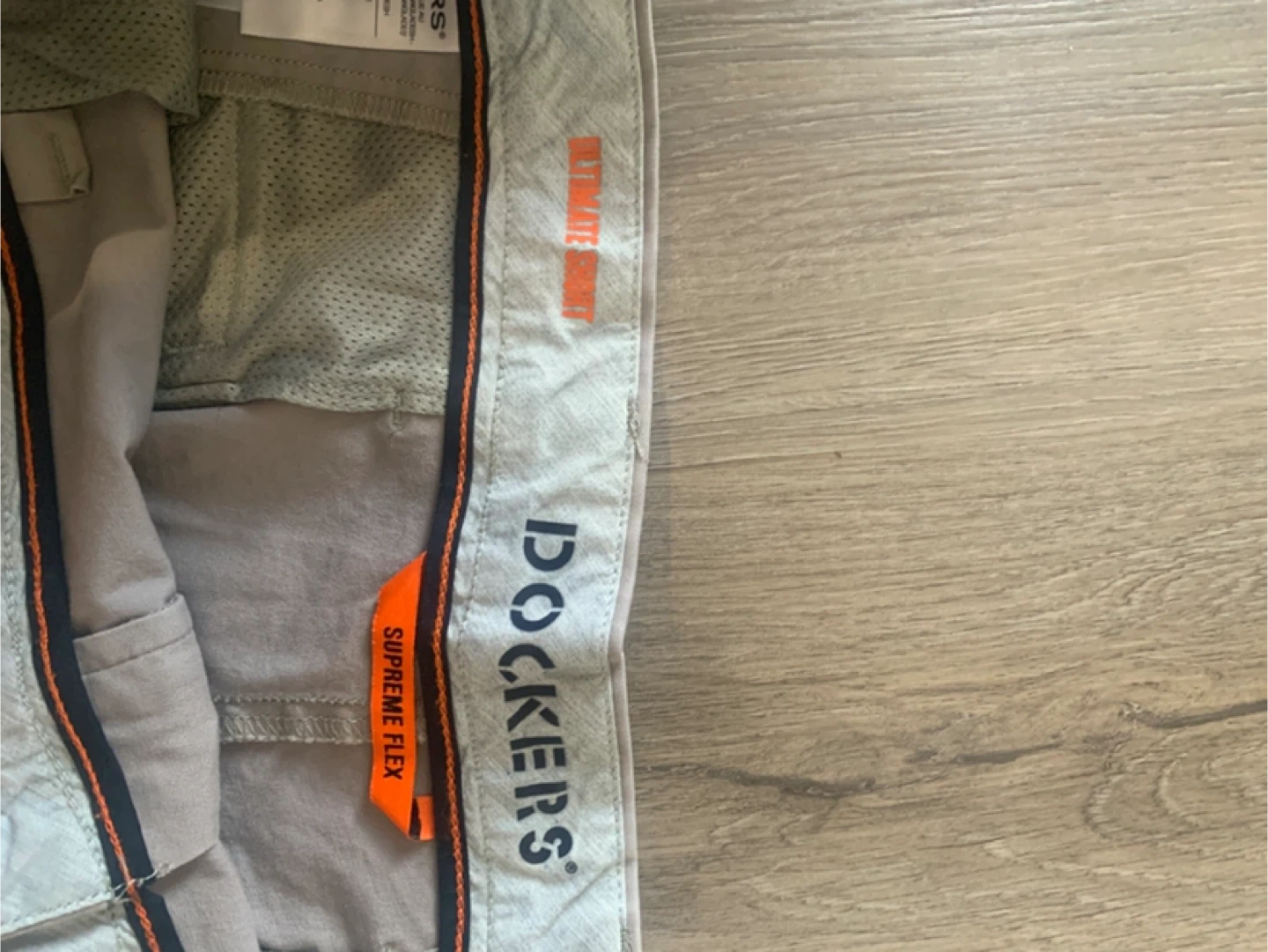 These like new Dockers chinos feature a Supreme Flex waistband for added comfort. They are a size 40 with a grey colour. Made with a blend for durability and a comfortable fit.