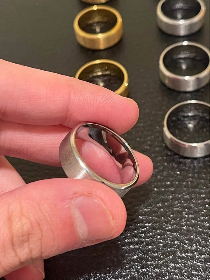 18k gold plated and silver rings. Gold sizes available are 6, 7, 8. Silver sizes available are 6, 7, 8, 10, and 11. These have a smooth polished finish and beveled edges. Price is $10 each.
