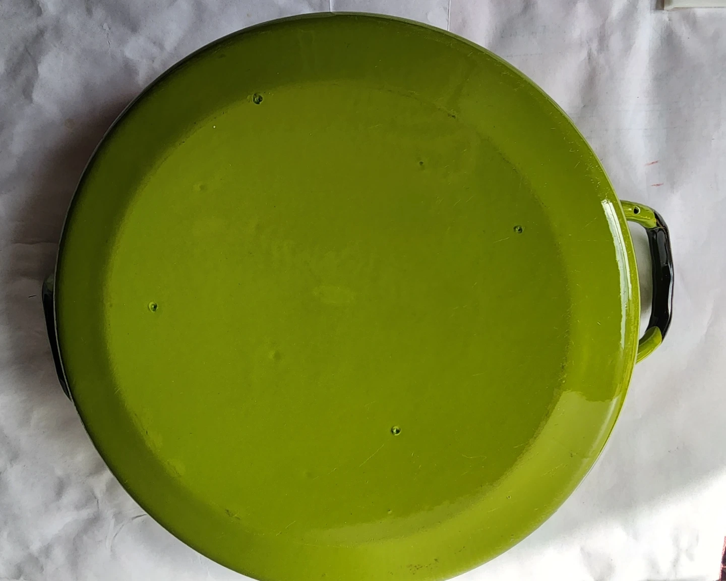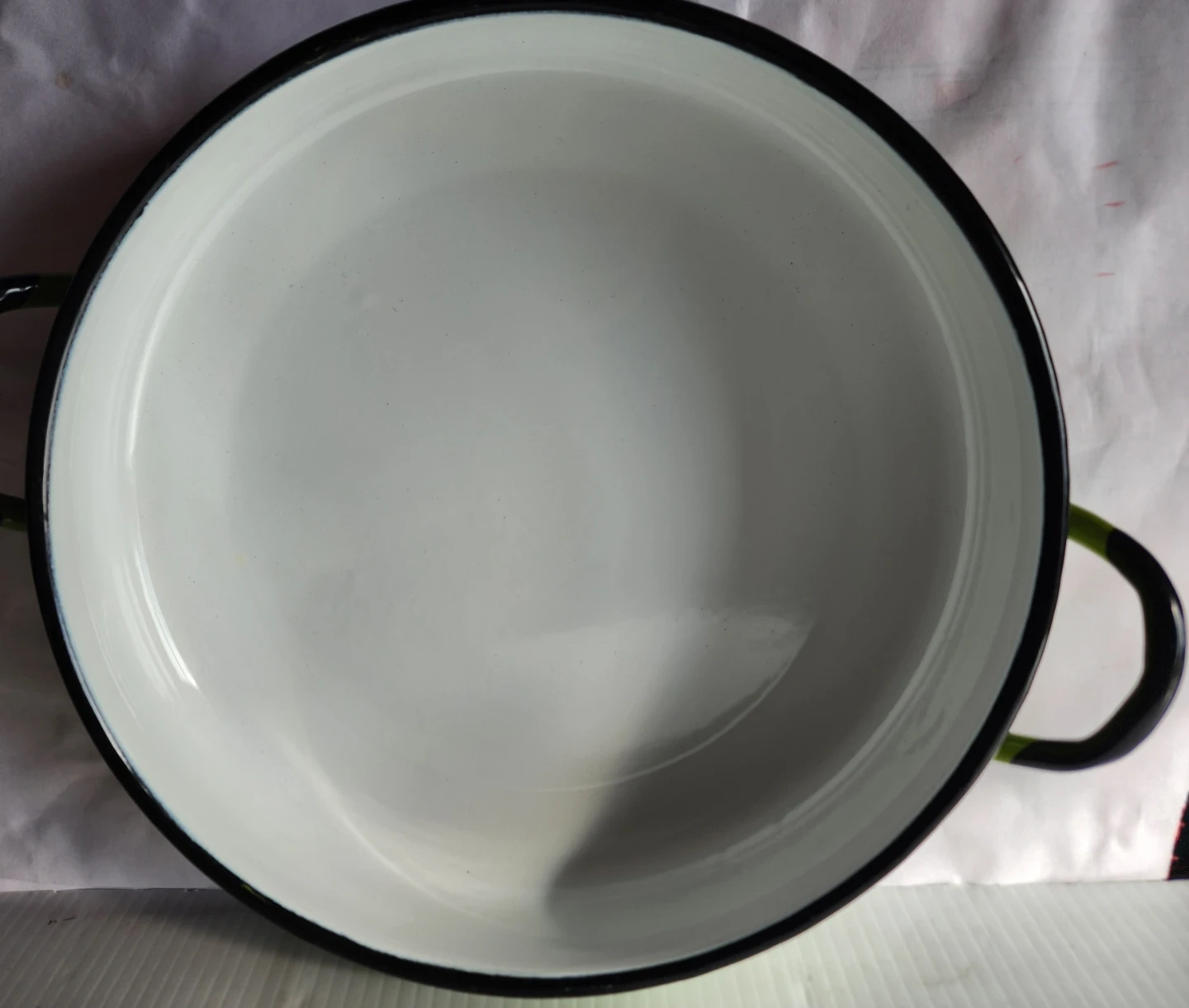 This is a large enamel pot with a white interior and a green exterior. It comes with a clear heavy glass lid. This pot has two black handles for easy carrying.