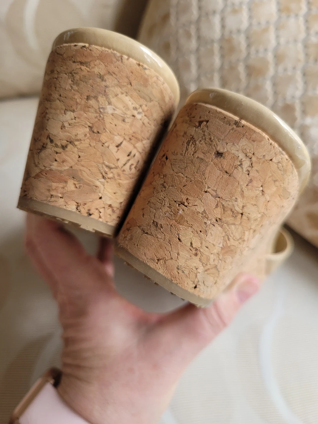 Jimmy Choo Beige Patent Cork Wedge Sandals