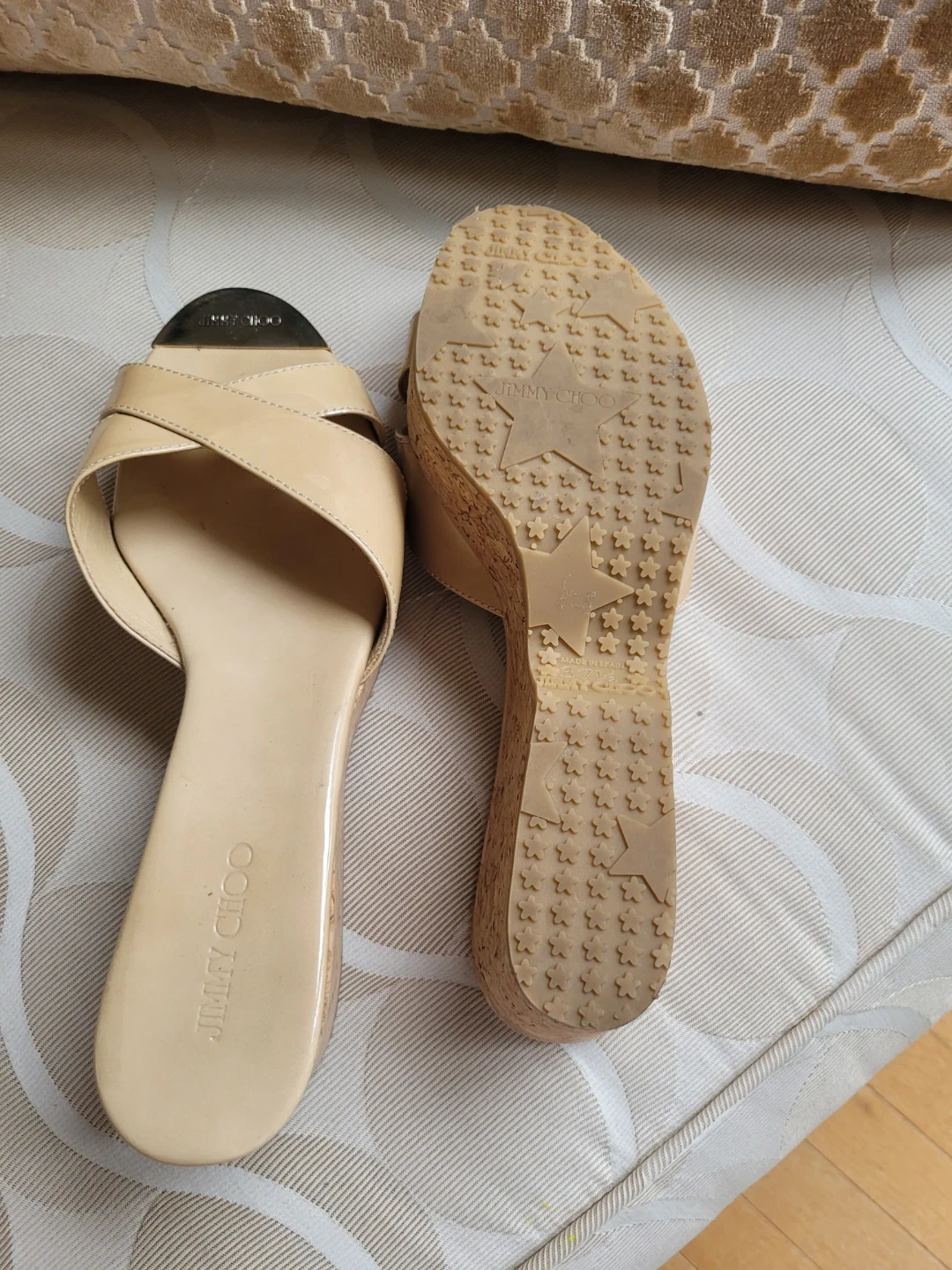 These stylish Jimmy Choo wedge sandals are a lovely beige colour with a patent finish. They feature criss-cross straps and a cork wedge heel. A chic addition to any summer wardrobe! Gently worn sz 37.5 Smokefree person/household.