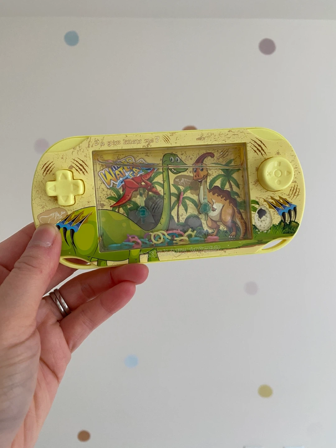 This is a handheld water game featuring a fun dinosaur theme. The game includes colourful rings and water for interactive play.
