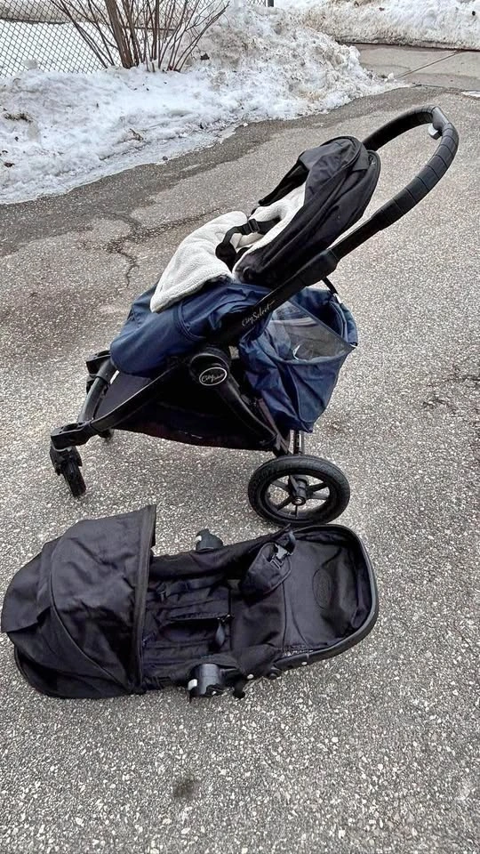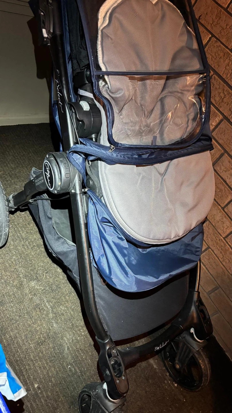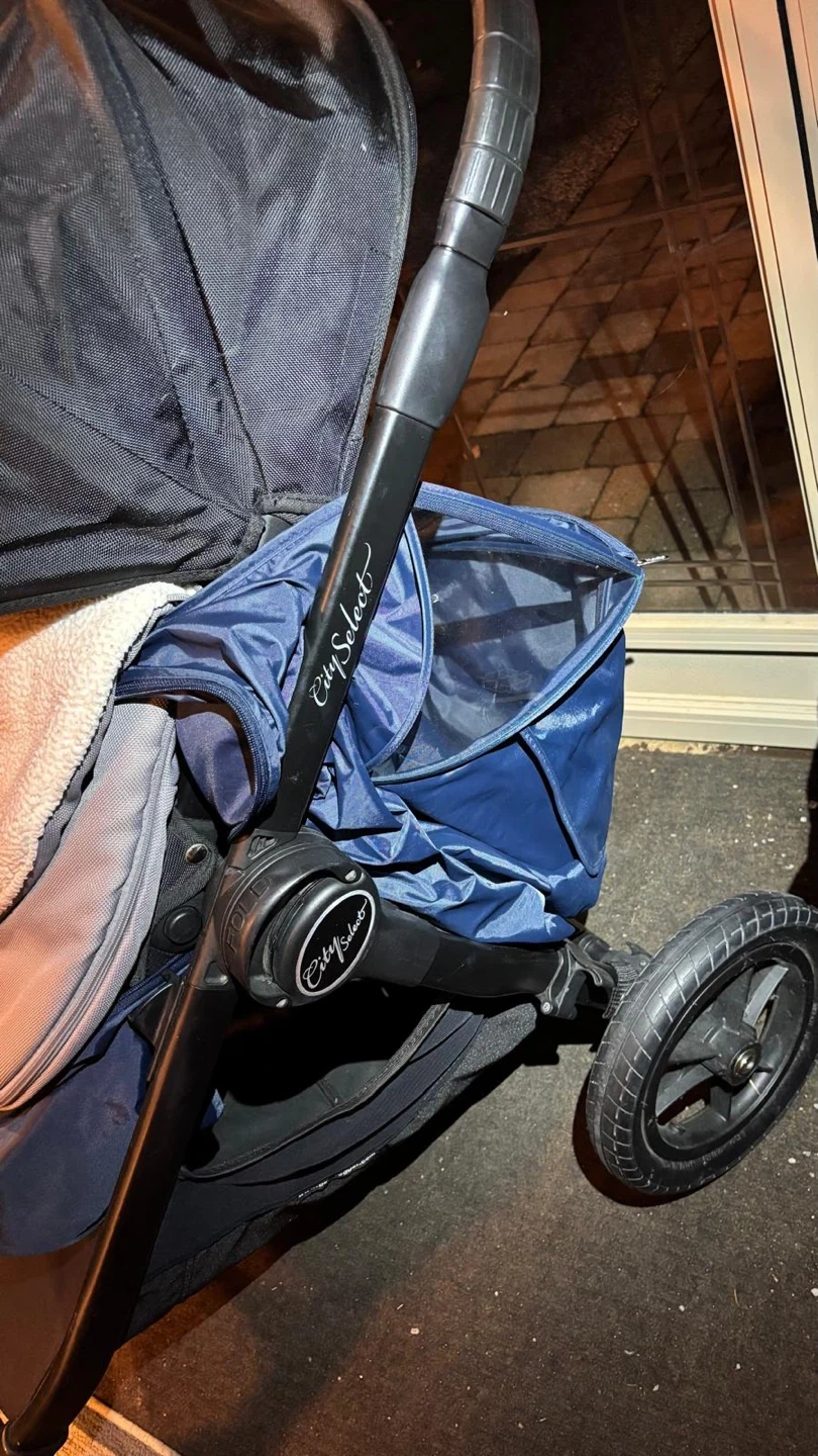 Versatile Baby Jogger City Select stroller system. Includes the main stroller with one seat and a super cozy white liner. Also comes with an extra seat or bassinet attachment, so you can configure it how you need. Super handy for one kiddo or two. Easy to fold and push around.