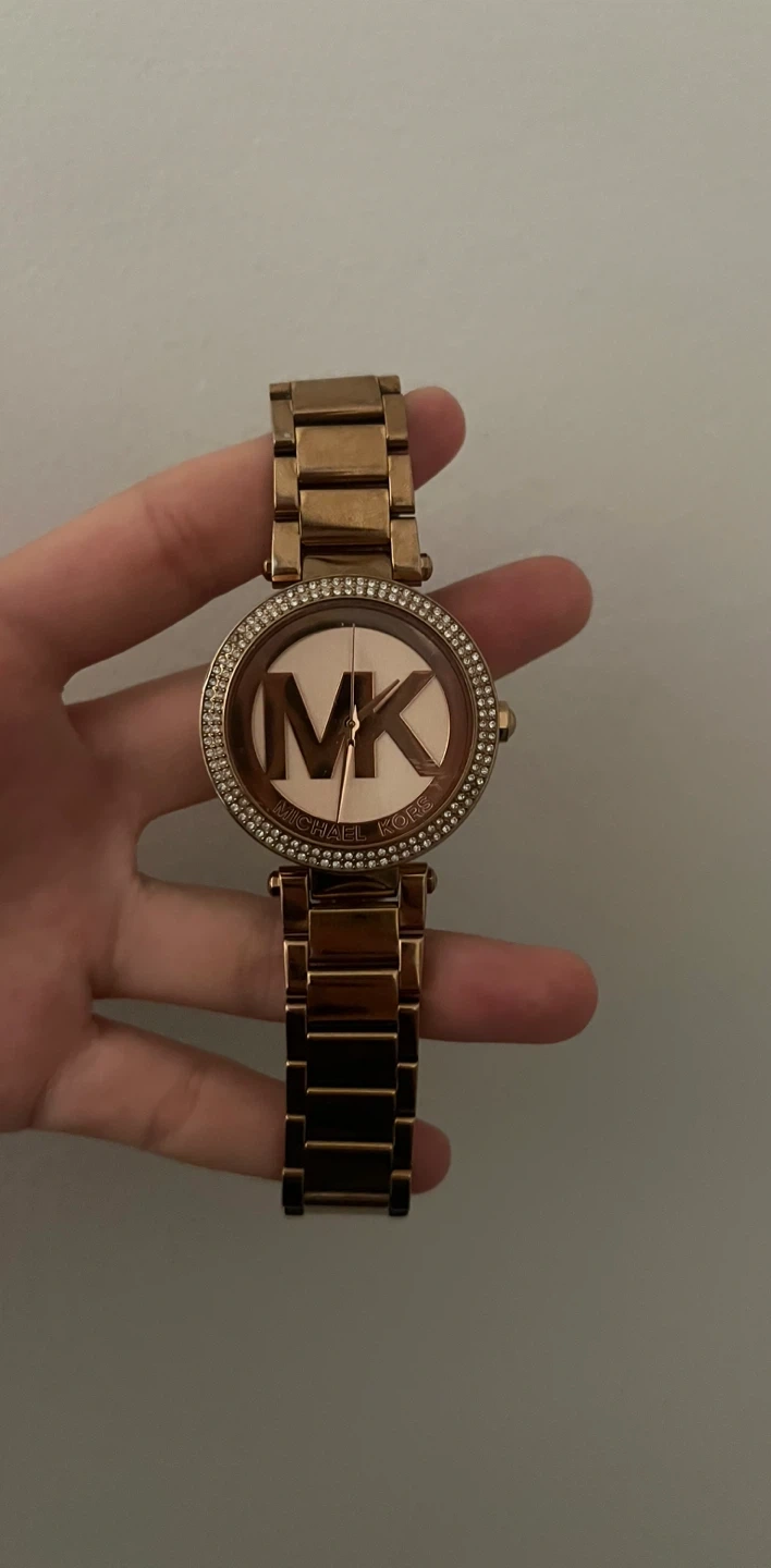 Rose goldtone Michael Kors watch. Features a crystal-embellished bezel and a large MK logo on the face. Rose goldtone stainless steel band.
