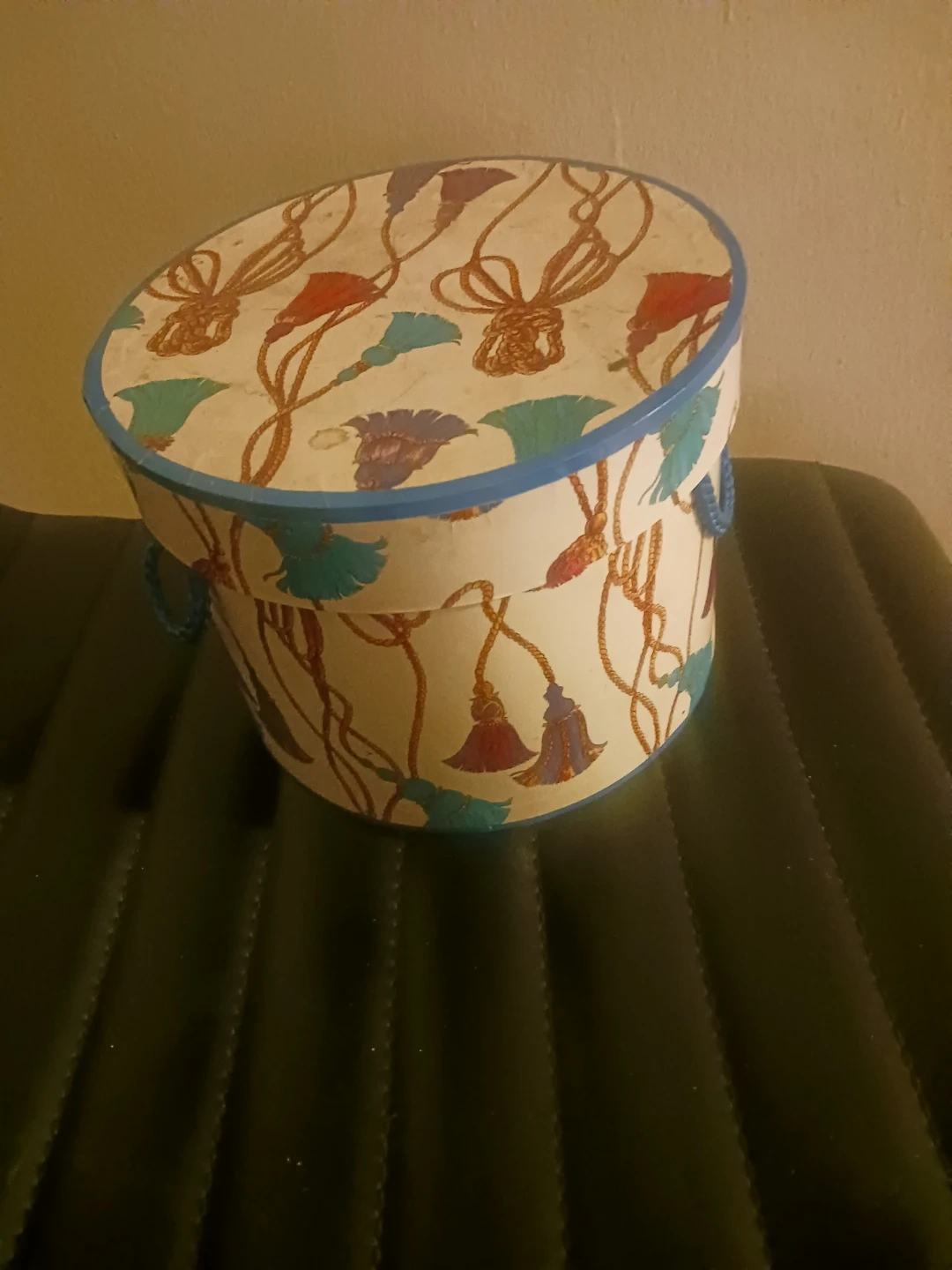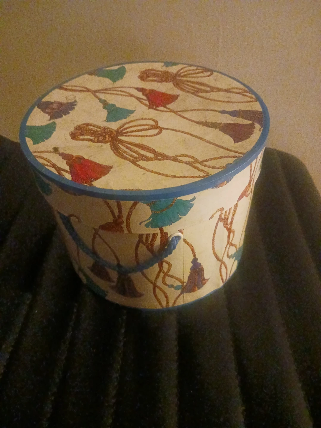 This is a decorative round storage box. It features a cream-colored background with a repeating pattern of tassels and rope accents. The box has blue trim and braided blue handles. It's perfect for storing small items or as a decorative accent piece!