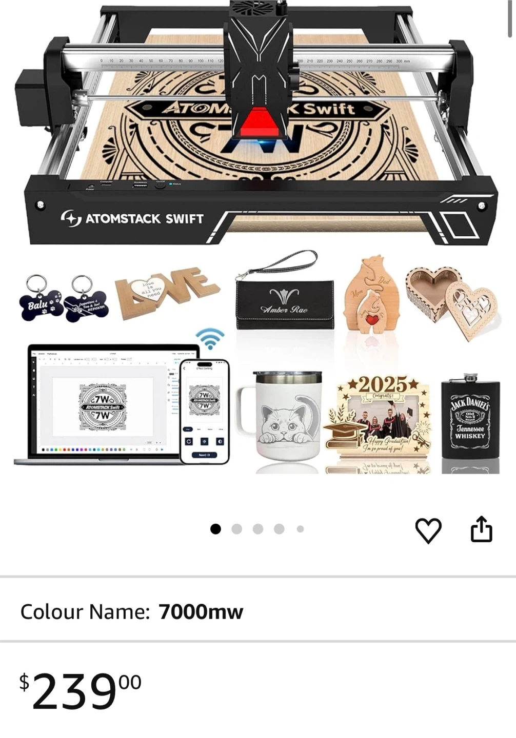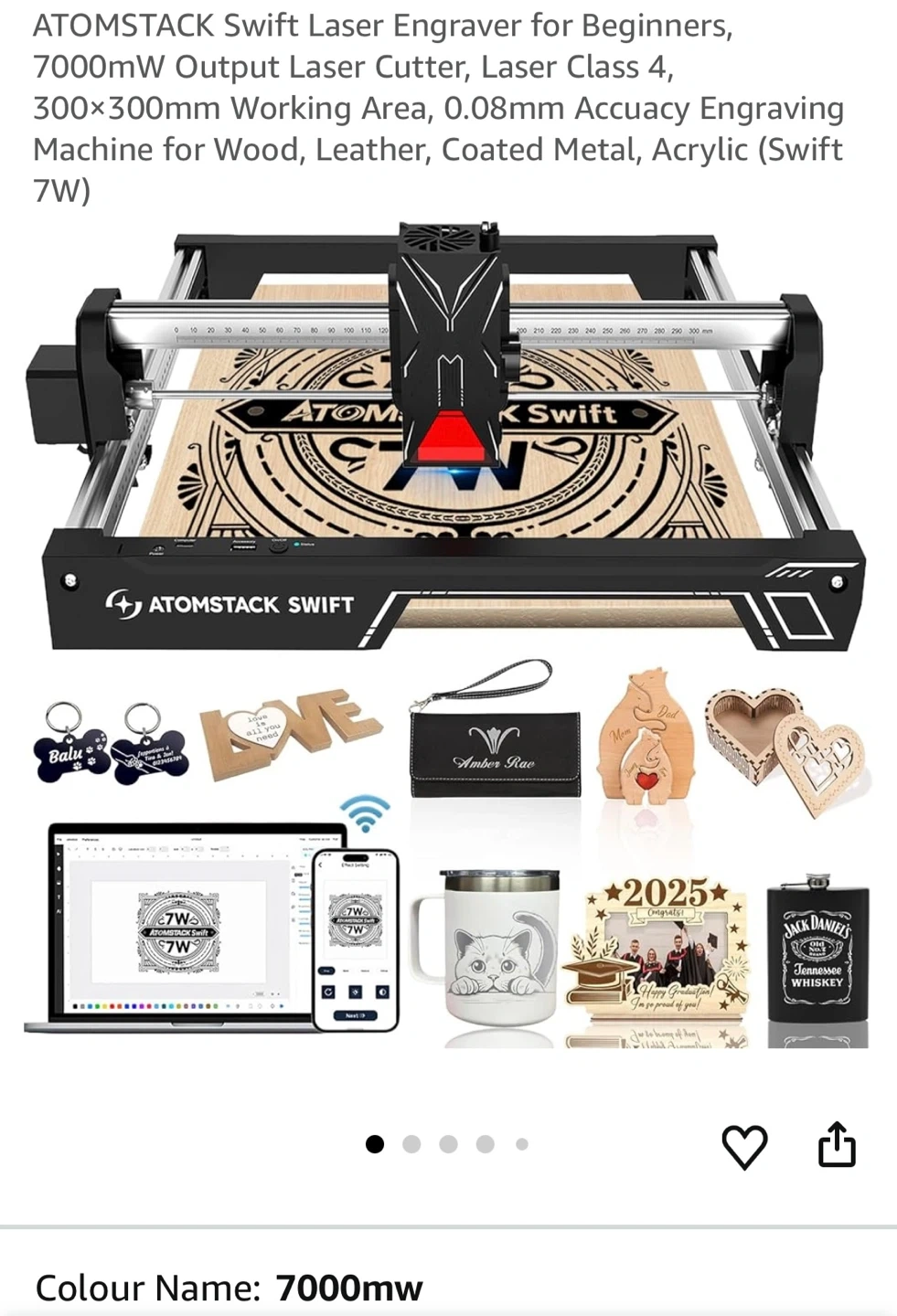 2 in 1 Engraving and Cutting. 7w Output Laser. Precise Engraving. Stable Cutting. 600mm/s Fast Speed. 0.06*0.08mm Laser Spot. 300*300mm Work Area. AI Smart Software. Easy to Focus. Safety Danger Alert. Eye Protection. Tilt Detection. Overheat Alarm. Ideal for Beginners. 5 minute Assembly.
