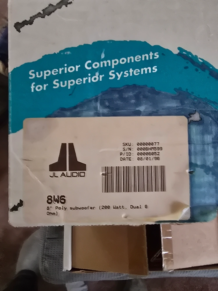 10Selling a JL Audio 8W6 8" Poly subwoofer (200 Watt, Dual 6 Ohm). It comes with the original box. The manufacturing date is 1996 August 01 Never used
