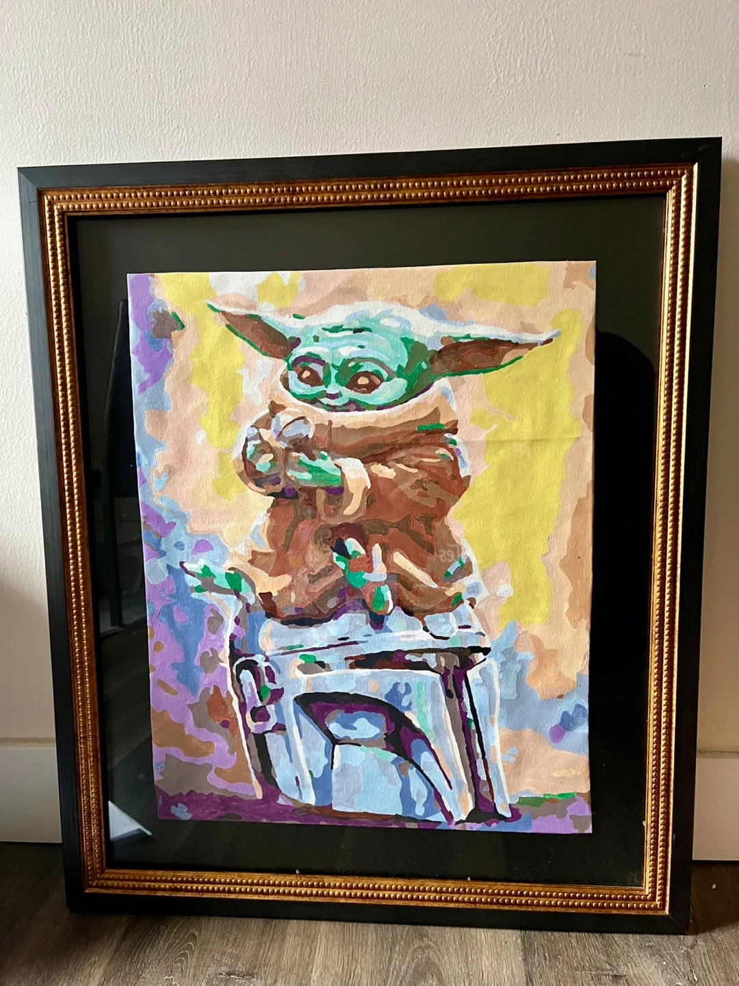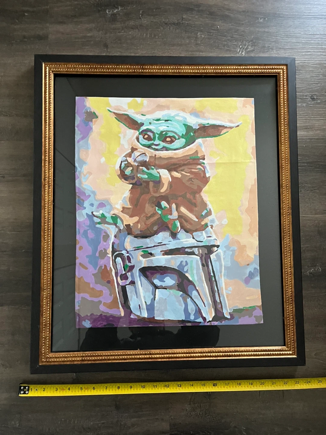 This is a framed paint by numbers artwork featuring Baby Yoda. It measures approximately 16x20 inches, not including the frame. The artwork is ready to hang and would be a fun addition for any Star Wars fan!