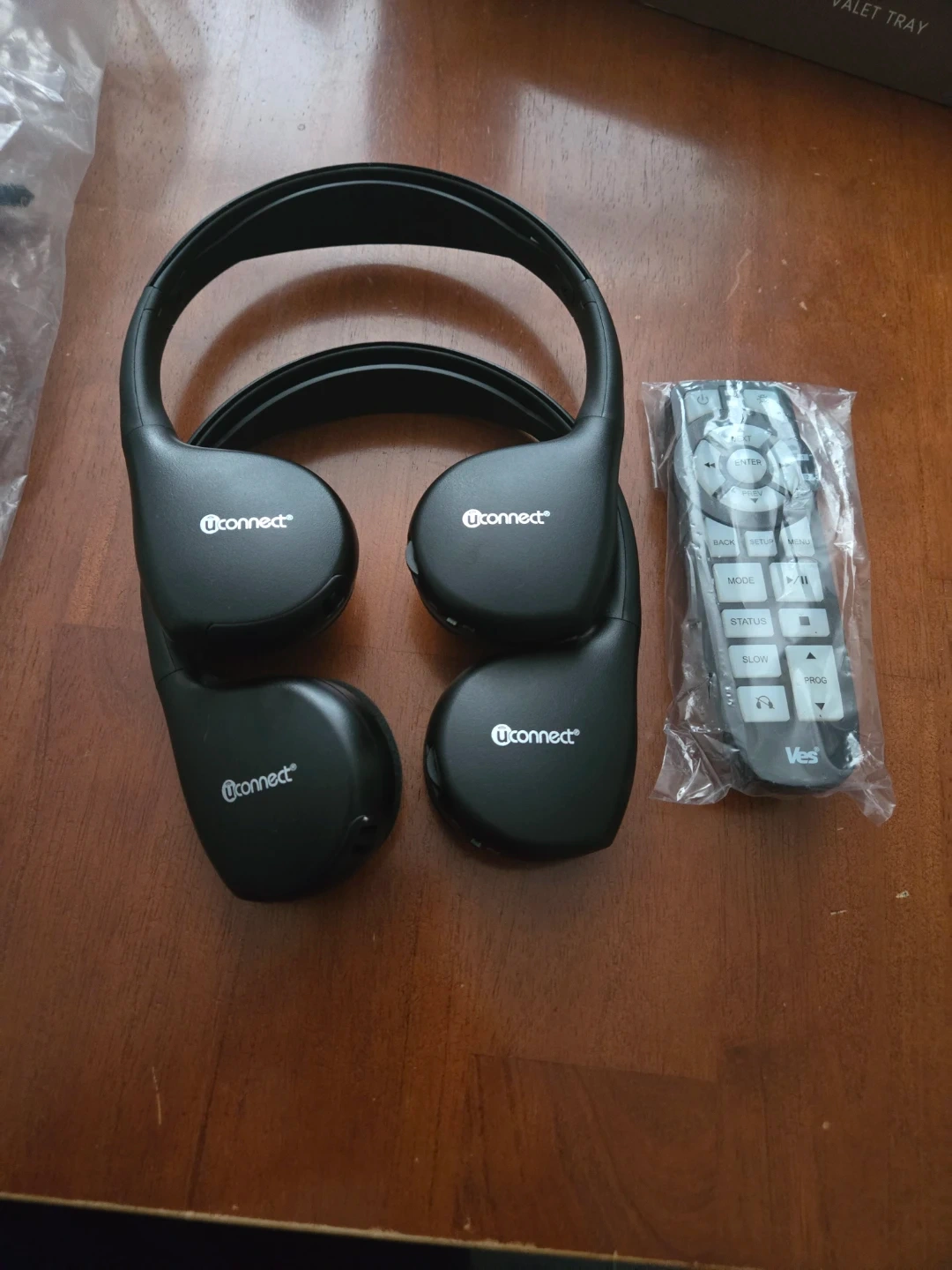 Wireless headphones with a remote control, perfect for in-car entertainment. Includes original packaging and all components. These headphones connect wirelessly and offer clear audio. Great for keeping passengers entertained on long drives!