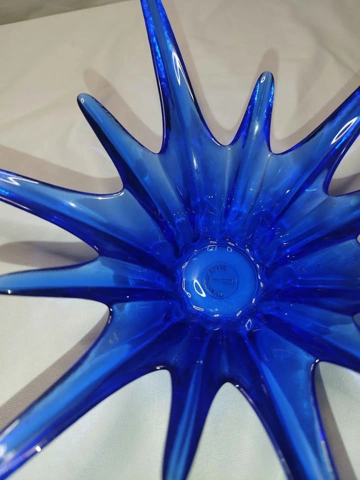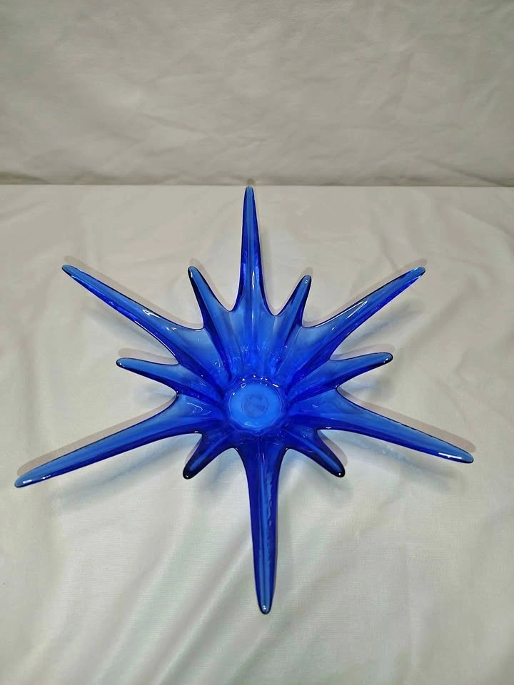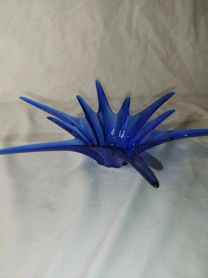 Blue starburst glass sculpture. The sculpture is made of blue glass and has a starburst shape with multiple pointed spikes. It has a glossy finish. Small. Pick up Stony Plain Spruce Grove area.