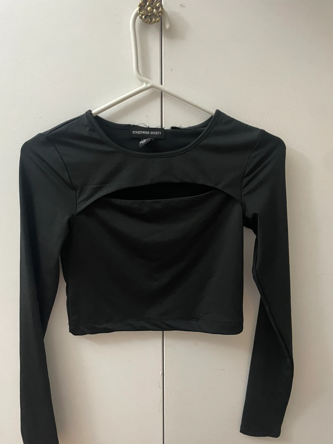 This black long sleeve crop top features a front cutout detail. It's made of a stretchy material for a comfortable fit. It would be a stylish addition to your wardrobe!
