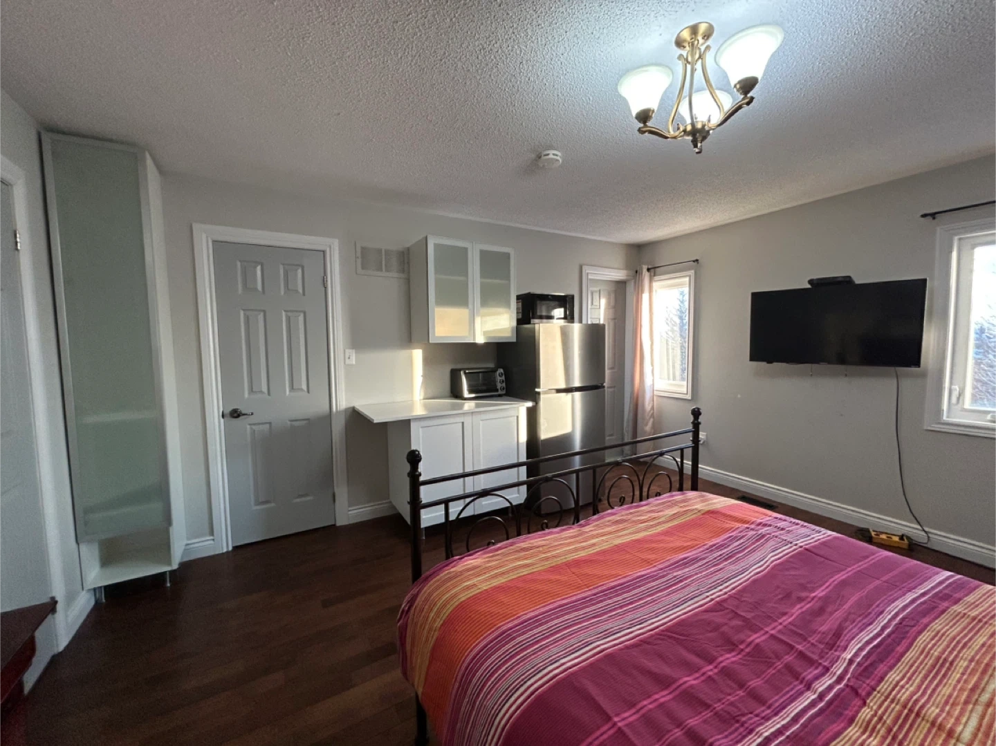 This is a large, fully furnished room with a private ensuite bathroom and a walk in closet. Inside the room there is a kitchenette with a microwave and toaster oven, as well as a private fridge. The space is bright with multiple windows and plenty of natural light. Furnishings include a queen size bed, desk, dresser, and TV.
