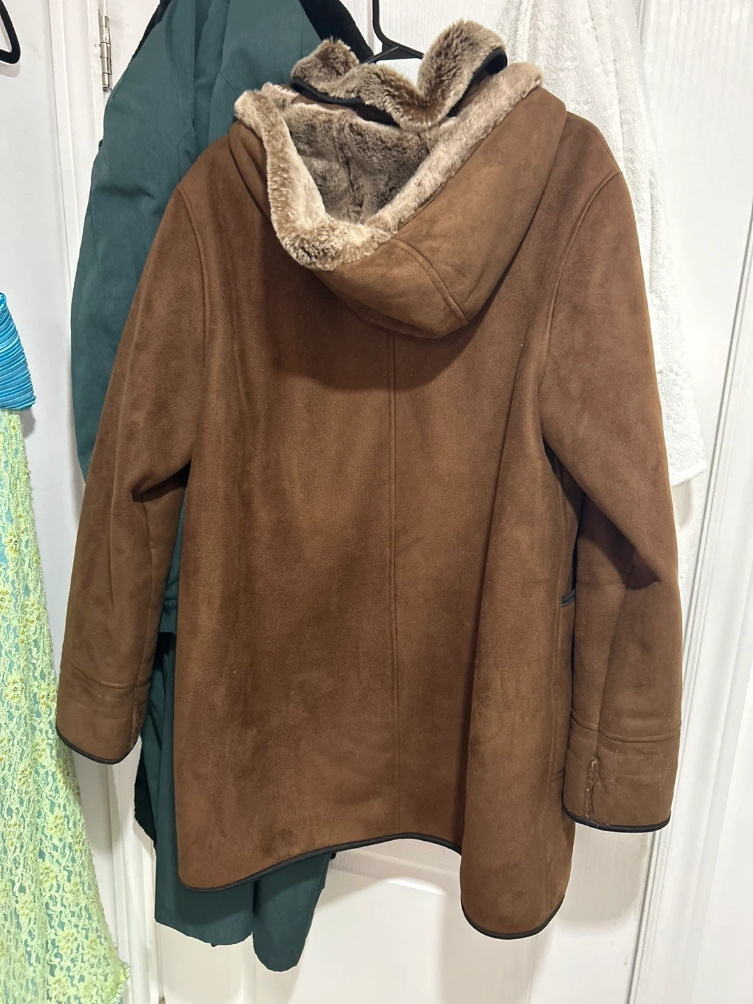 Warm brown jacket with a faux suede exterior and a cozy faux fur lining, complete with a hood. It's got button-up closure and handy pockets. Perfect for chilly days!