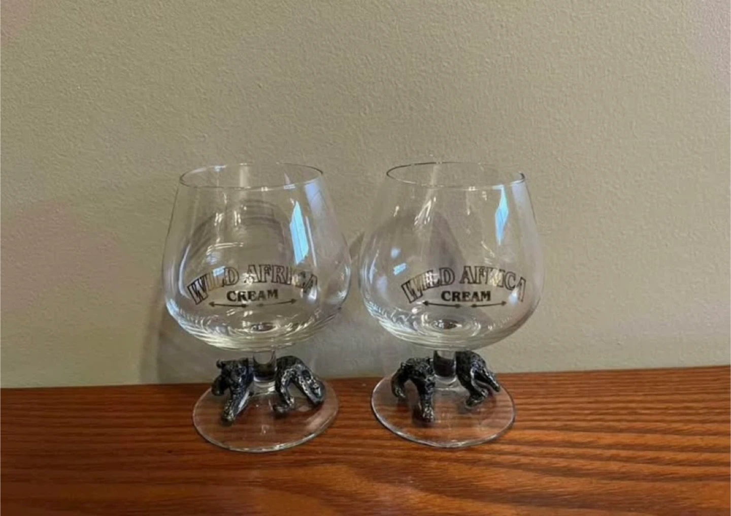 $20 Vintage pair of Wild Africa Cream Liqueur glasses with brass leopard.