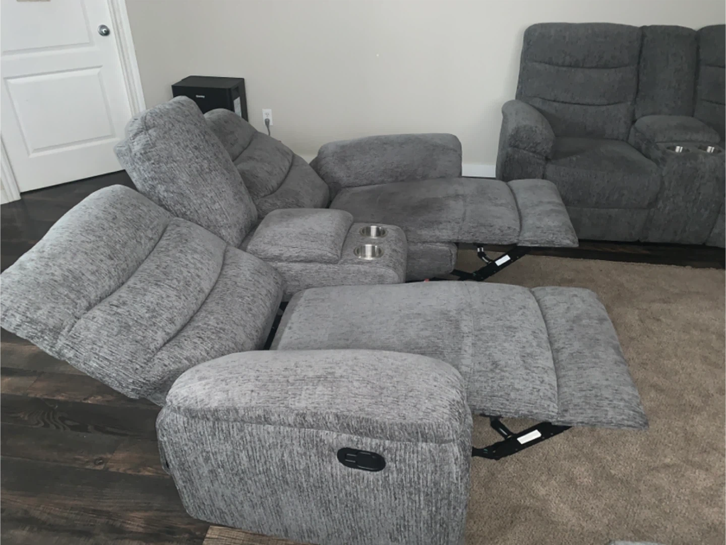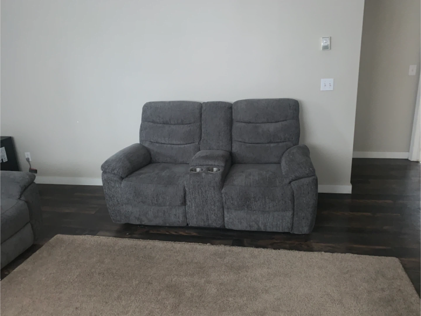 This grey recliner loveseat features two reclining seats with a centre console. It includes two built-in cup holders for convenience. The soft fabric makes it comfy for movie nights!
