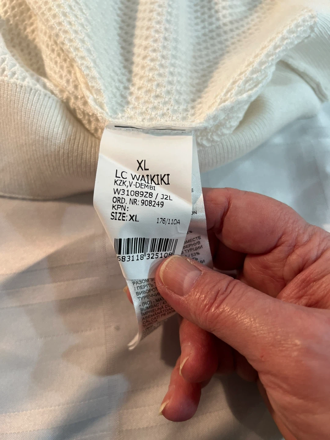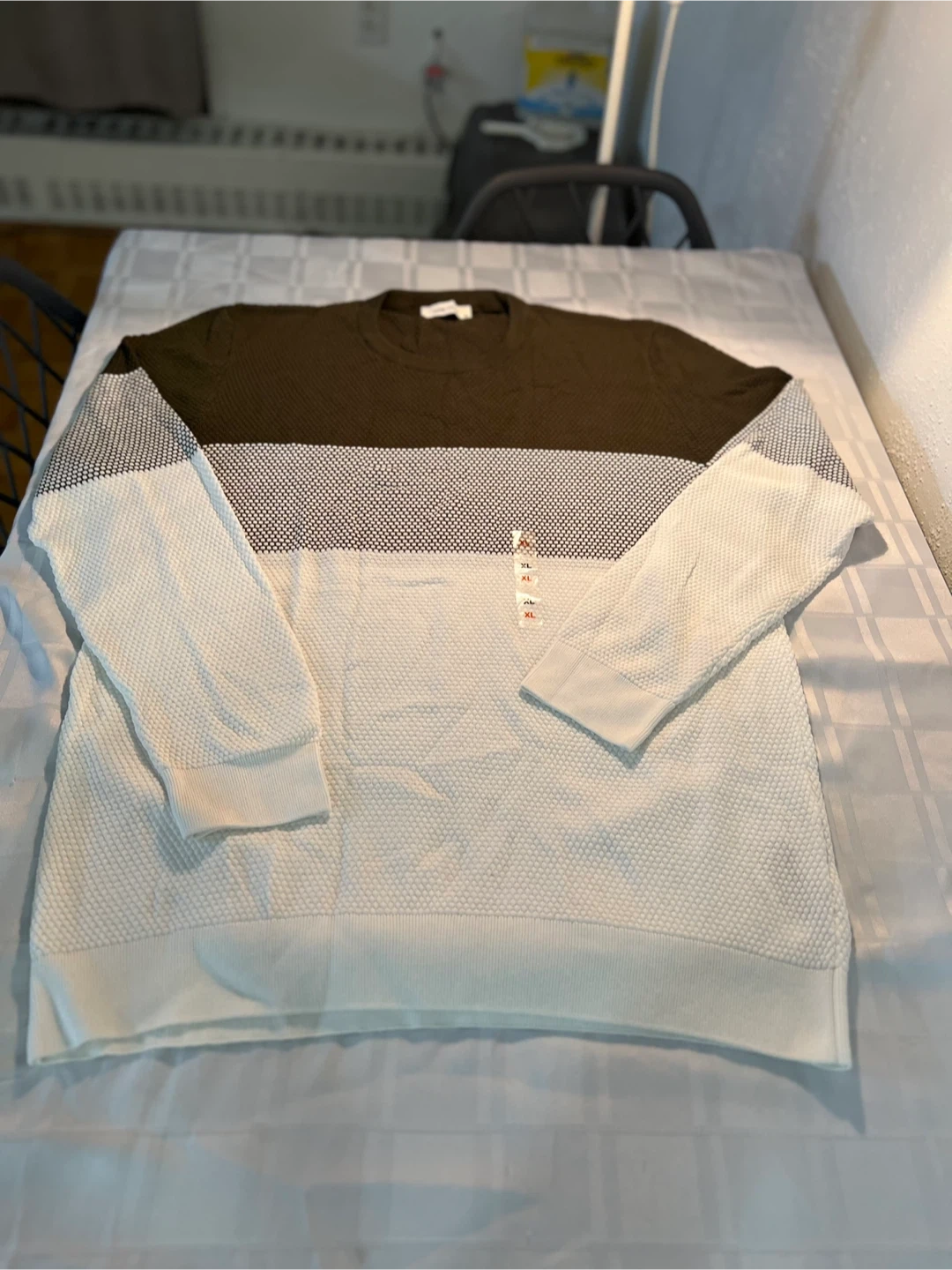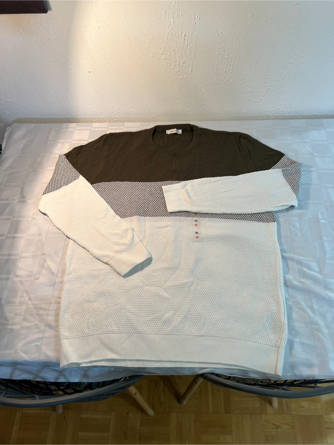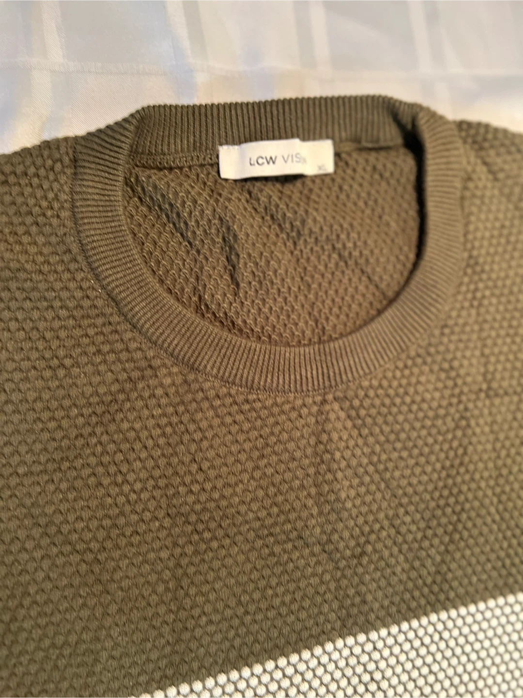 Selling a men's sweater from LC Waikiki in size XL. It features a unique colour block design with olive green, grey, and white. The material is a comfortable knit, perfect for layering!