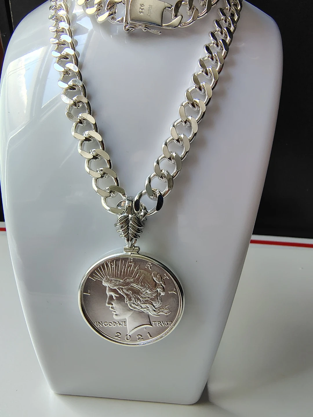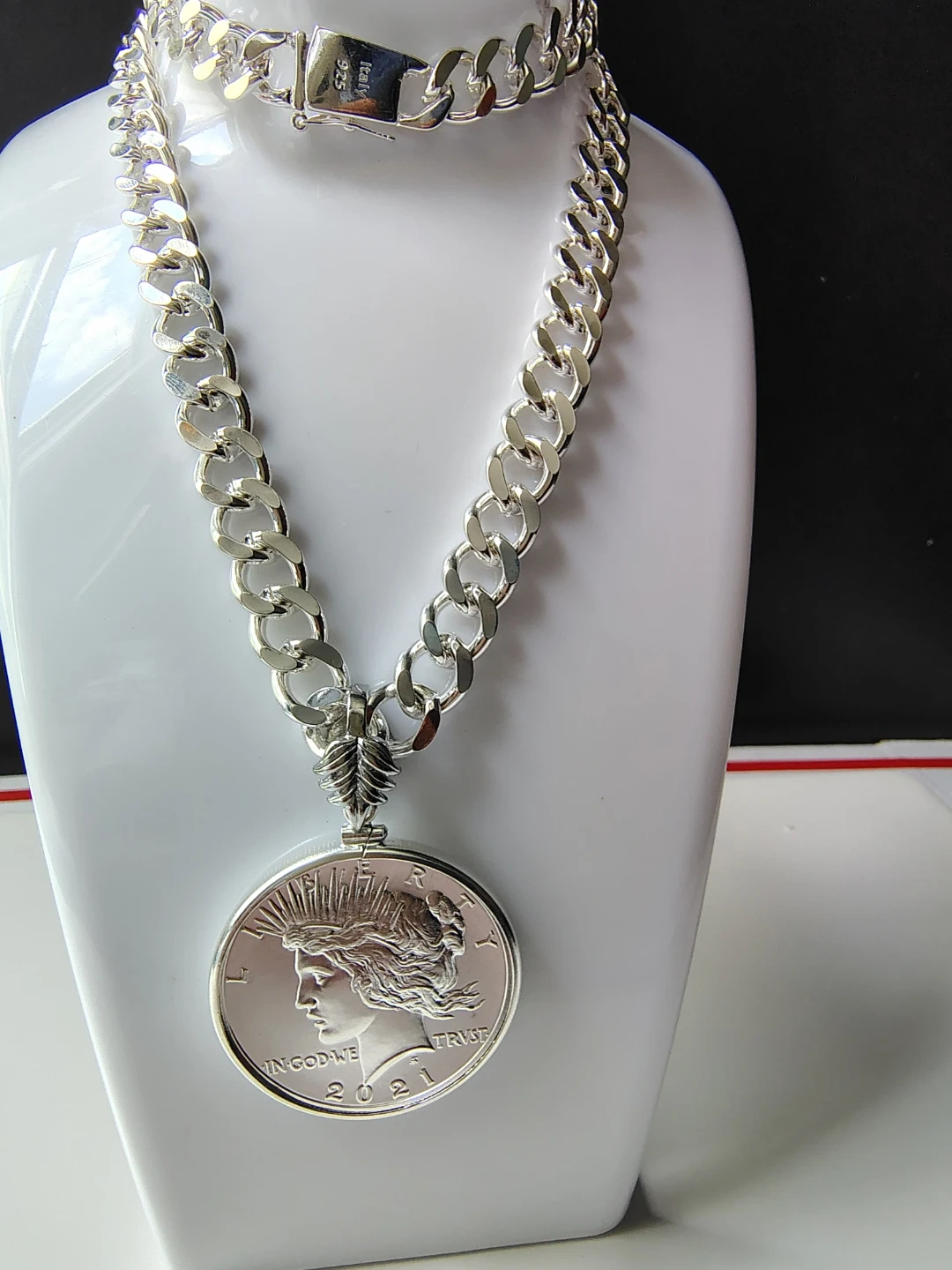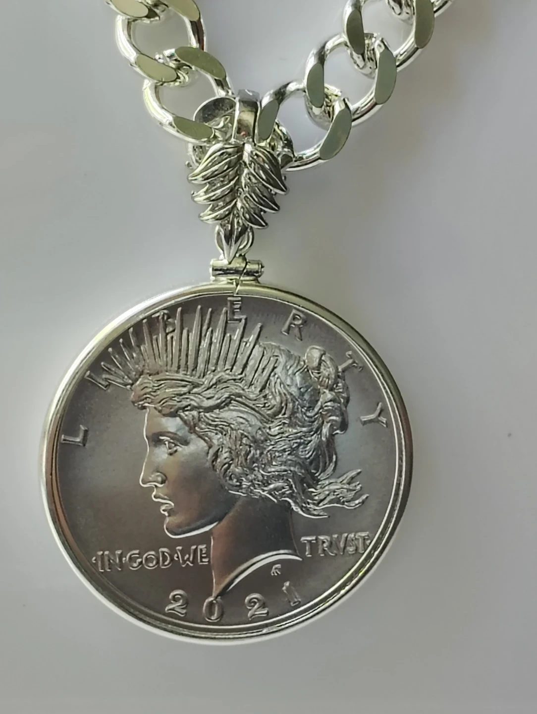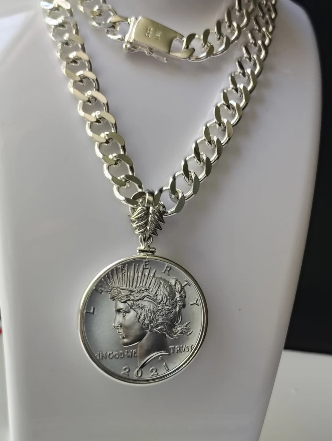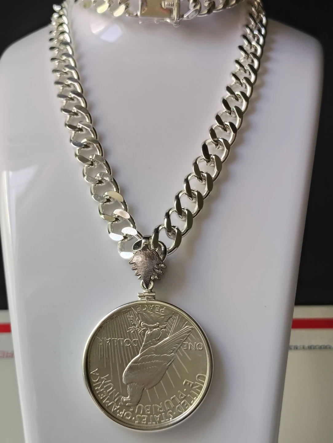 Hermoso collar chapado en plata con moneda de la paz certificada MS 69. 100th anniversary 1oz de plata pura, una verdadera joya numismatica.