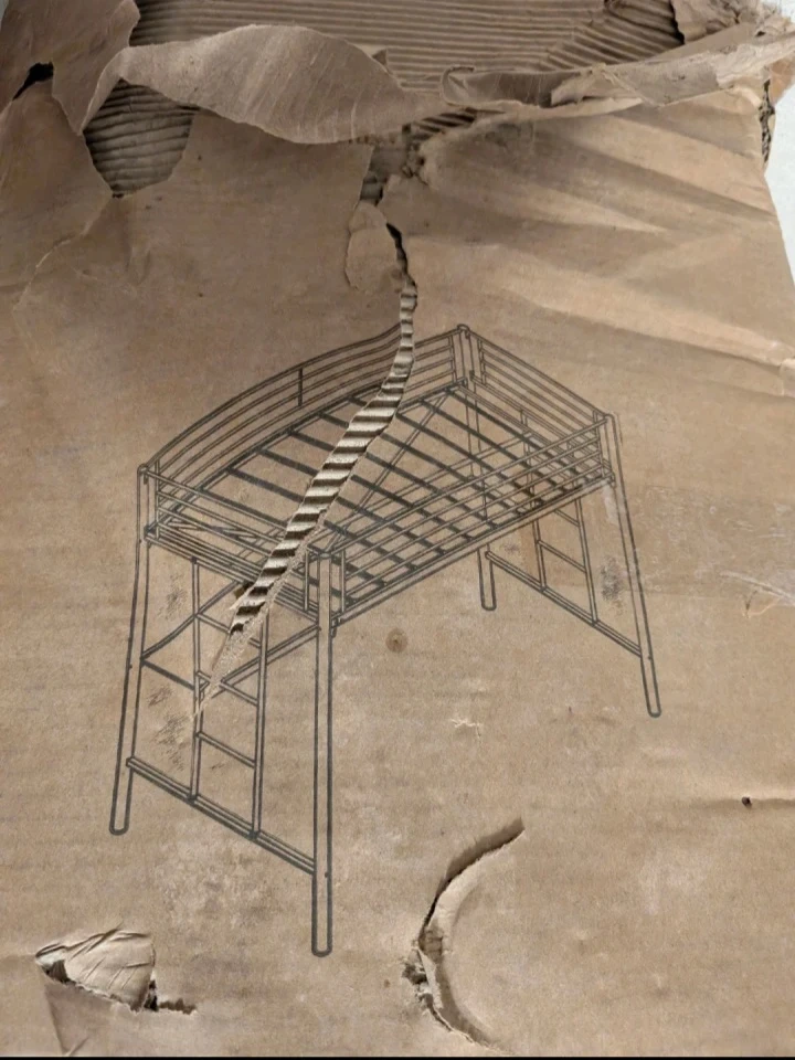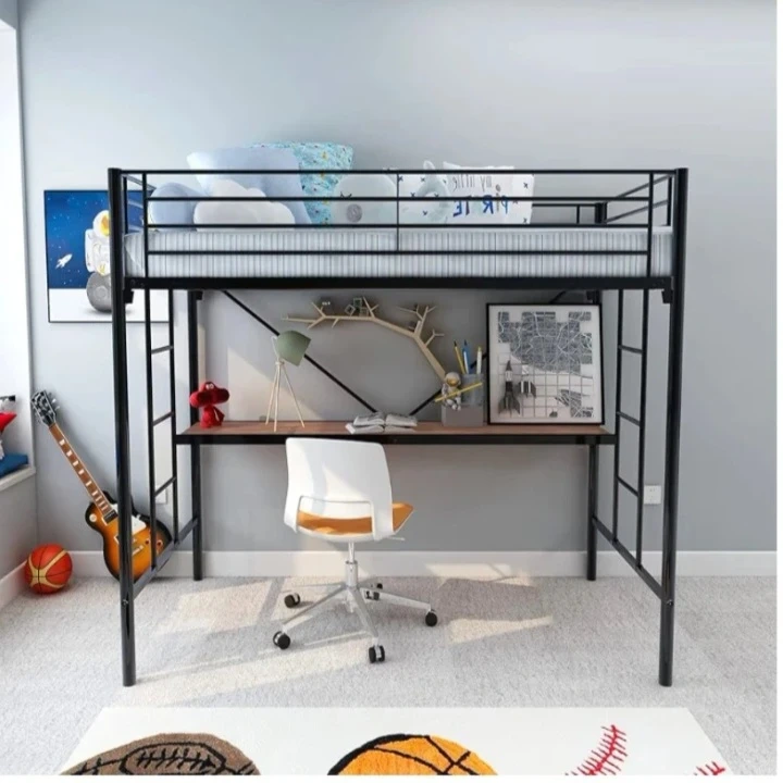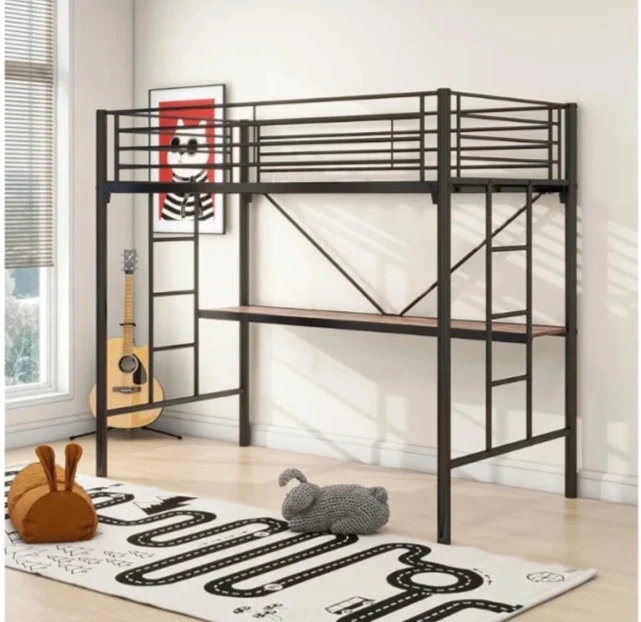 This black metal loft bed features a built-in desk underneath the sleeping area. It's constructed with a sturdy metal frame and includes a wood-tone desk surface. Assembly required.