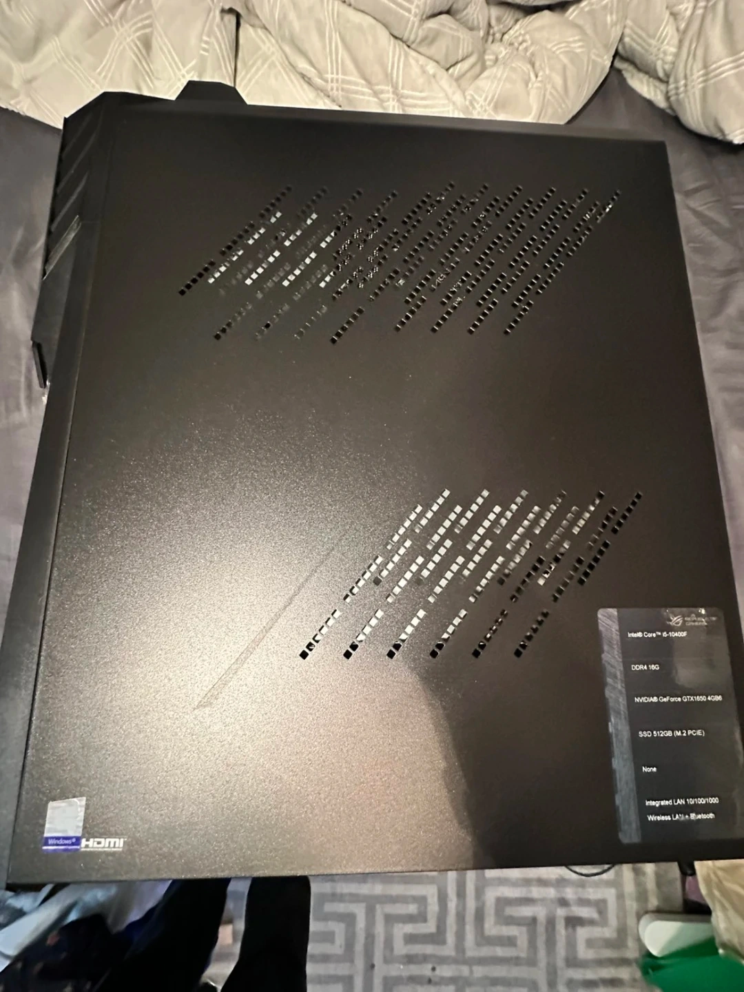 This ASUS ROG gaming desktop features an Intel Core i5-10400F processor NVIDIA GeForce GTX 1650 4GB graphics. It's equipped with 16GB of DDR4 RAM and a 512GB NVMe SSD