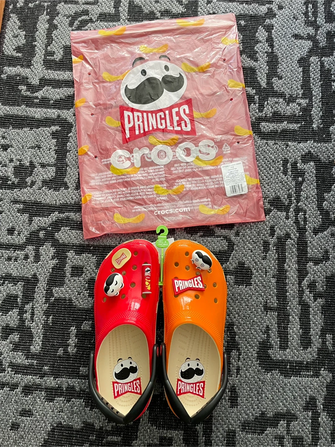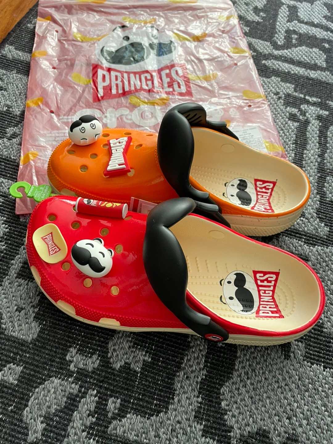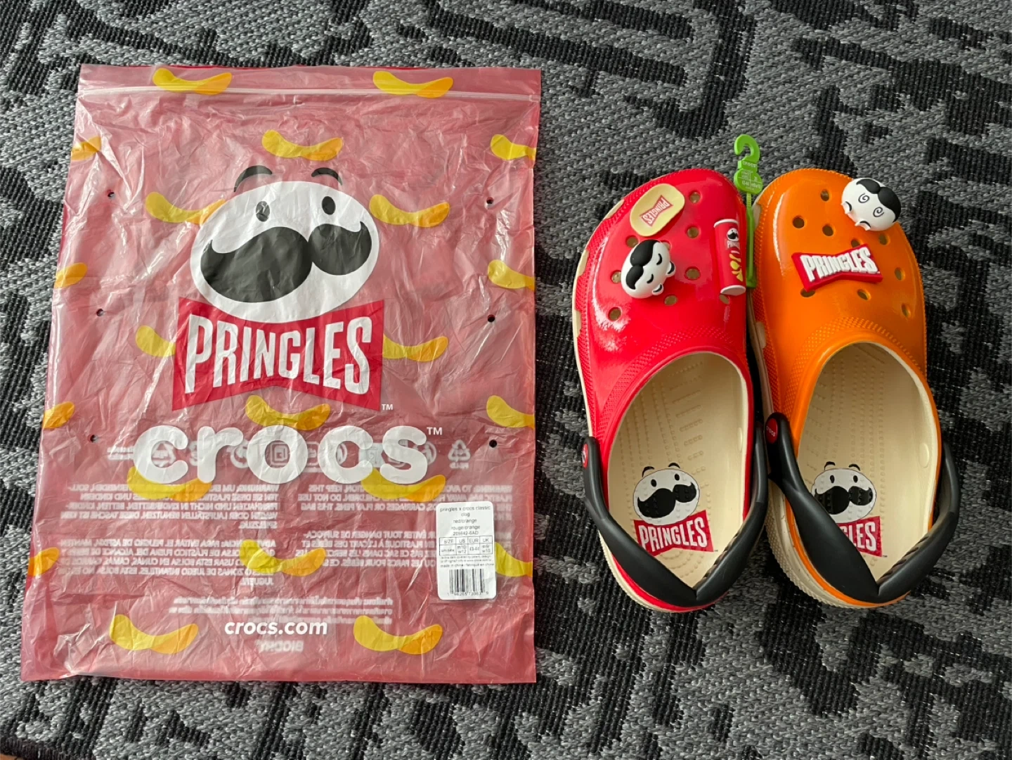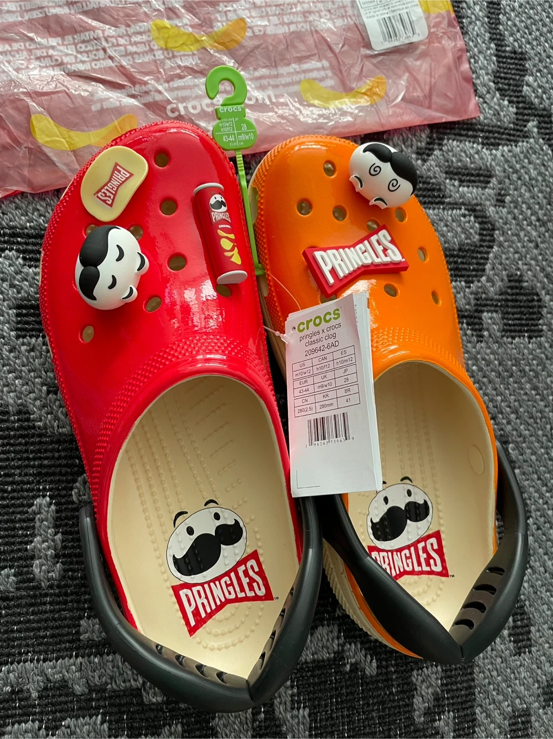 Brand new Crocs classic clogs, a fun limited collaboration with Pringles. These clogs come in a vibrant red and orange. Includes Pringles-themed Jibbitz.