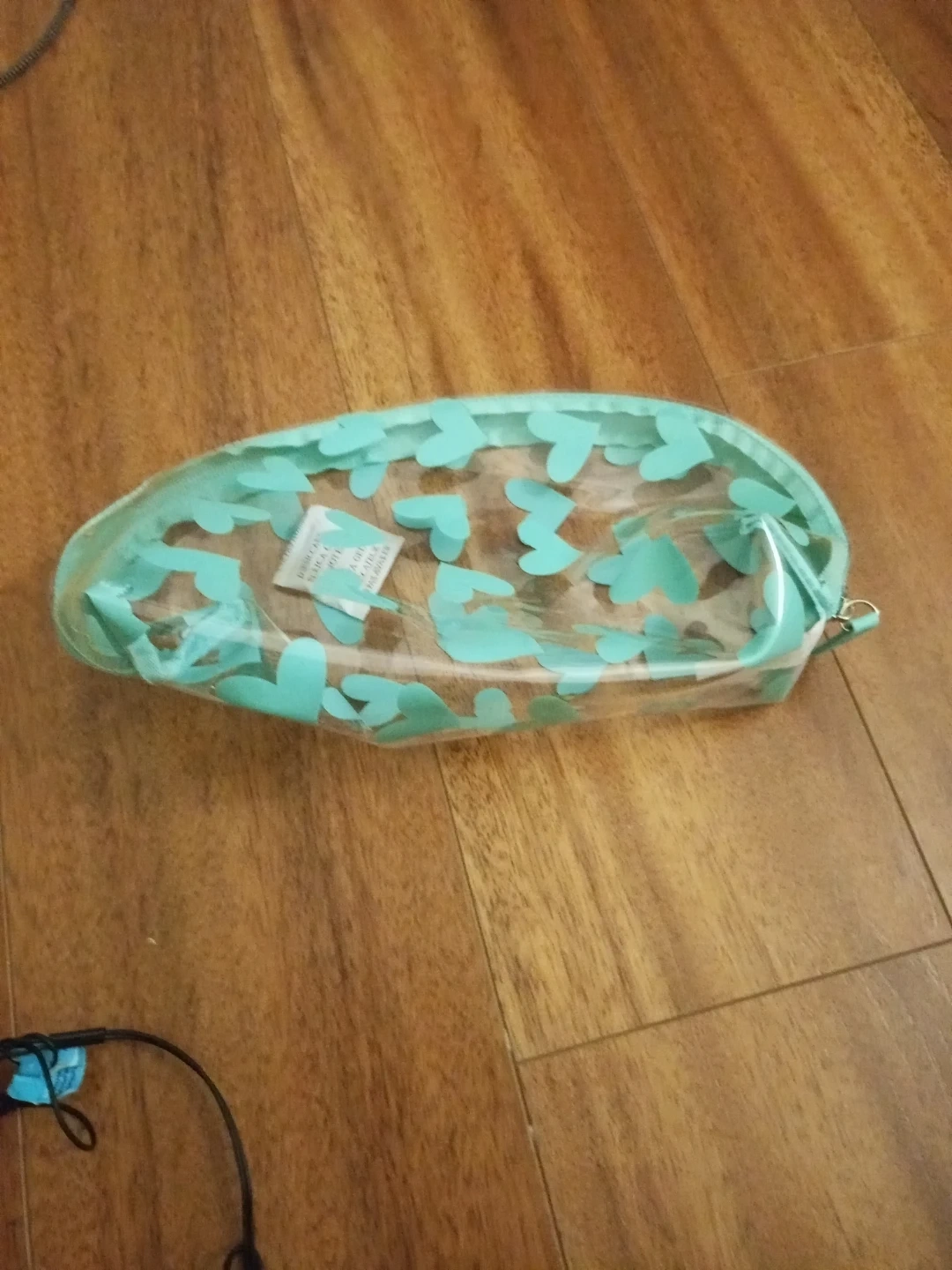 This is a clear pencil case with a cute teal heart pattern around the top. It's made of plastic and has a zipper closure. A small silica gel packet is inside.