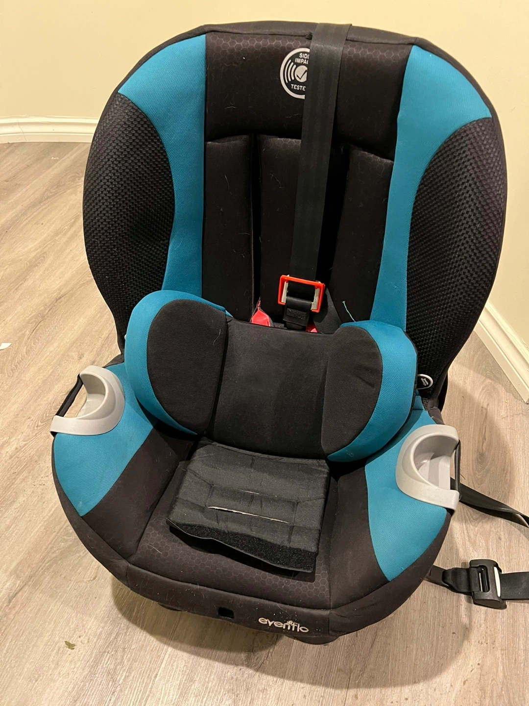 This is an booster car seat in blue and black. It's designed for children. The seat has adjustable straps for safety. This booster car seat would be useful for ensuring a child's safety during car rides.