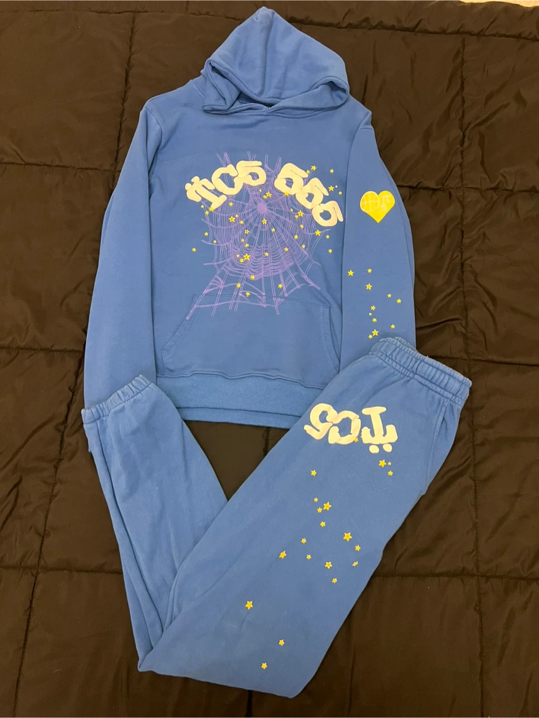 Blue hoodie and sweatpants set from SP5R. Hoodie features a spiderweb graphic and a yellow heart on the sleeve. Sweatpants have star graphics. Size small.