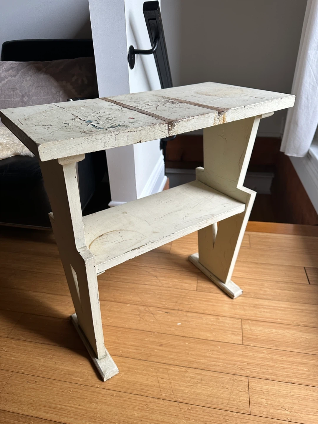 A really cool solid wood mcm side table with great modernist lines. Solid sturdy shape just needs a fresh coat of paint!