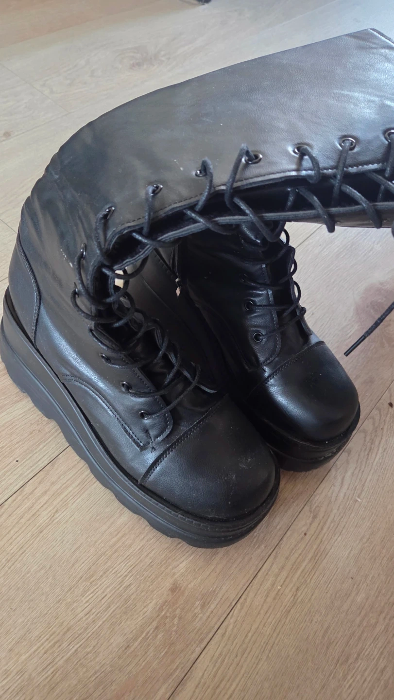 These black platform lace-up boots are in a size 43. They have a chunky sole and full lacing up the front. These boots are made of faux leather.