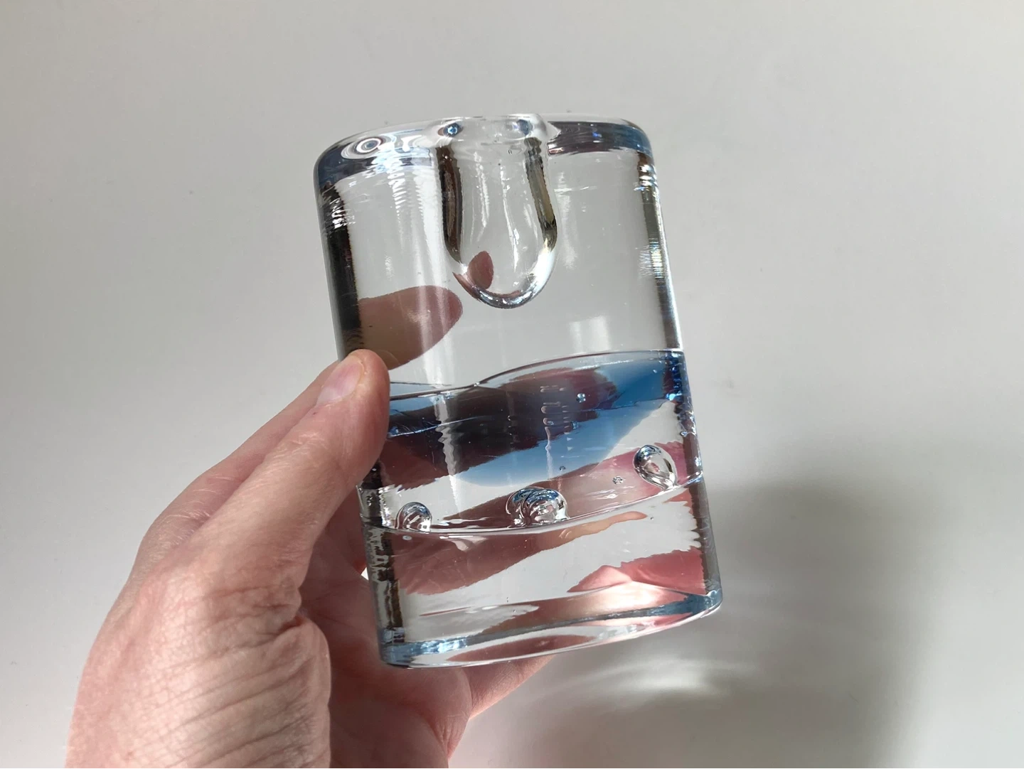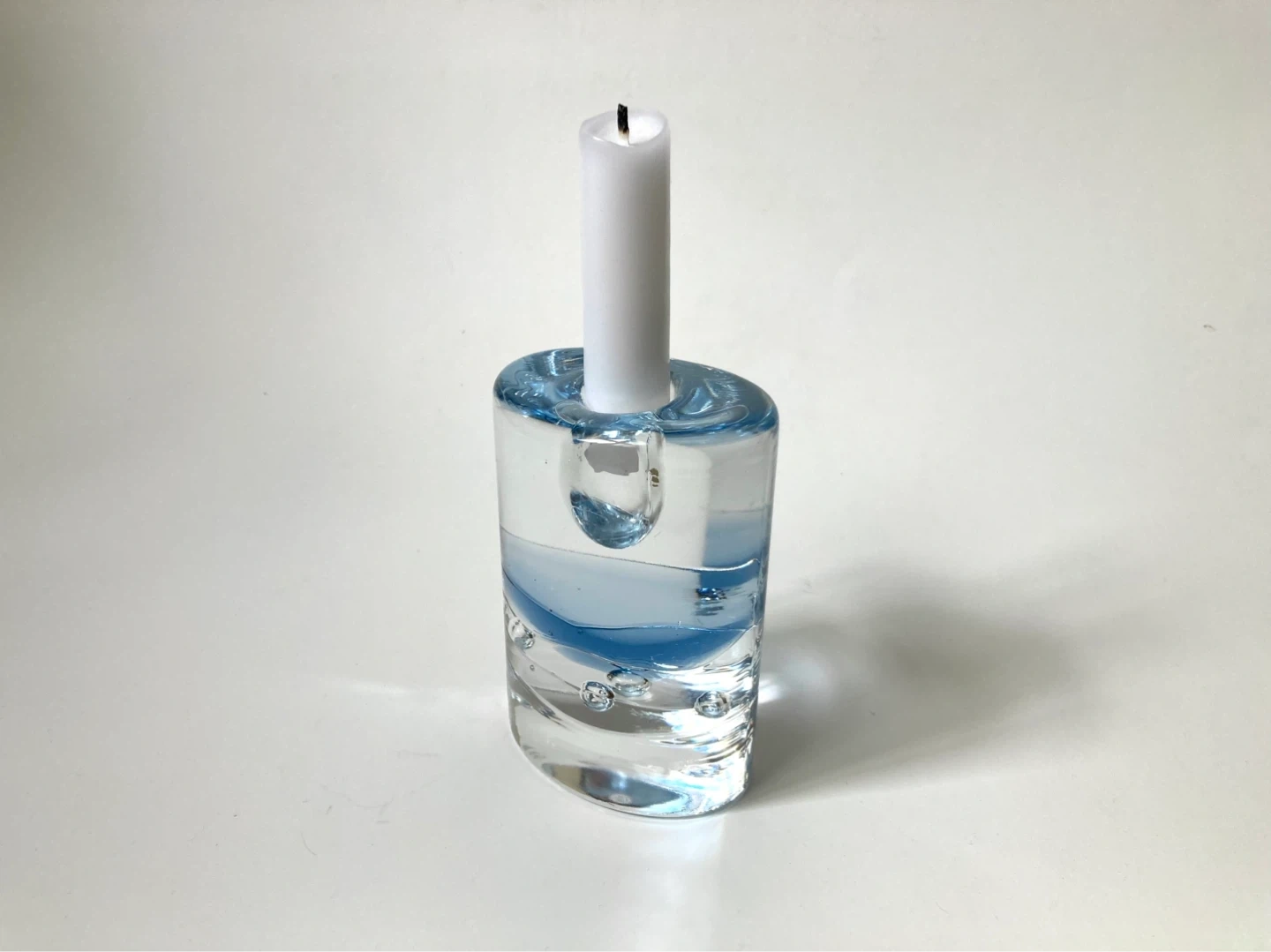 Postmodern Arktia glass candle holder, designed by the renowned Finnish artist Timo Sarpaneva for Iittala. Introduced in 1985 as an evolution of Sarpaneva's earlier Arkipelago series, the Arktia line is characterized by its heavy, clear "ice" glass and a distinctive blue-toned section that symbolizes water trapped under ice.