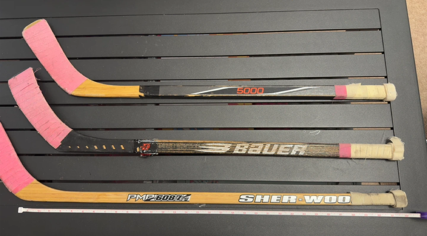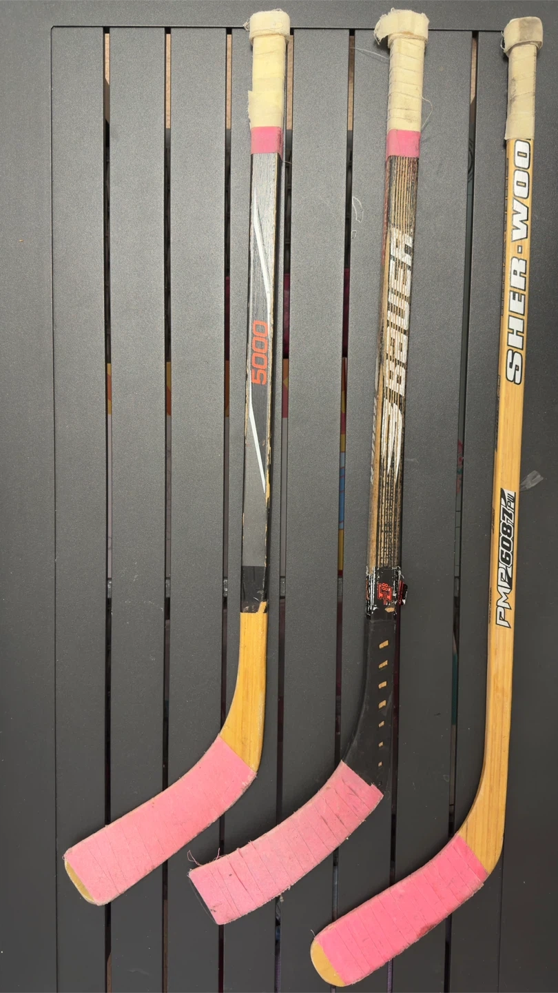 Three kids hockey sticks available, featuring brands like Bauer and Sher-Wood. They all have pink tape on the blades. Some wear is visible, consistent with use.