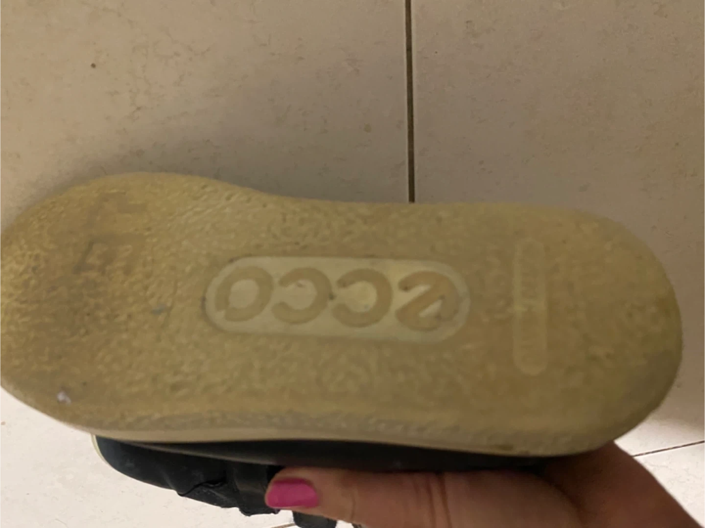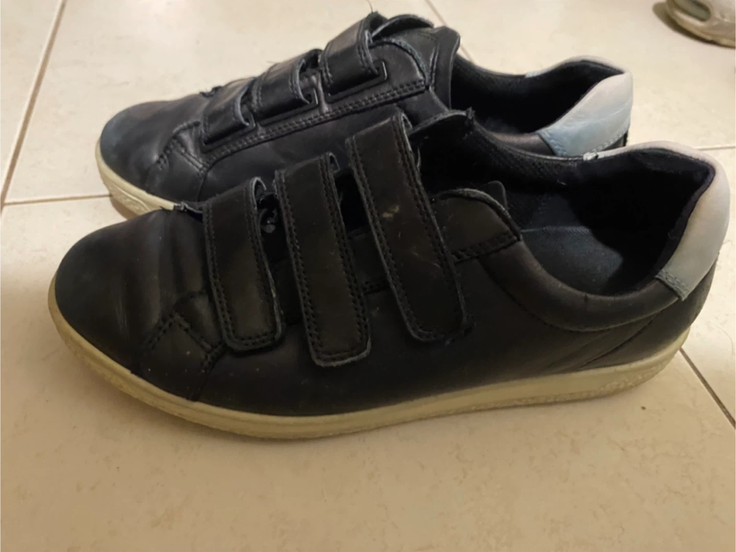 These are ECCO black leather shoes with three hook-and-loop straps for closure. They have a light grey heel accent. Perfect for easy on and off!