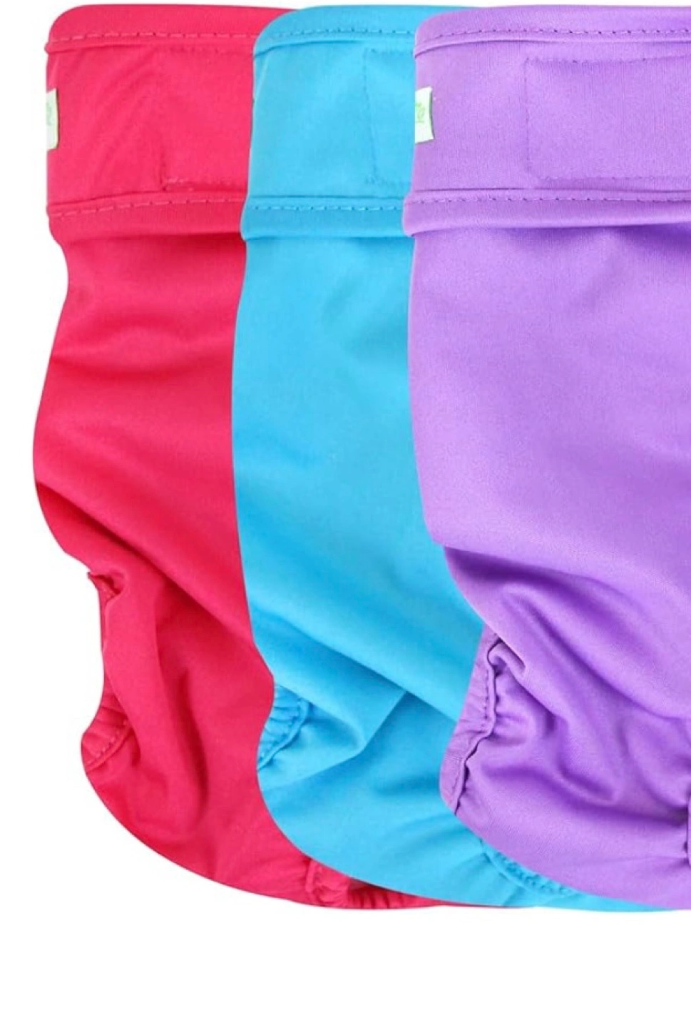 Wegreeco Premium Dog Diapers Female(3 Pack) - Durable washable Reusable cloth diapers in pink, blue, and purple. Each diaper features adjustable hook-and-loop closures and elastic leg cuffs for a snug fit. Size marked as small.