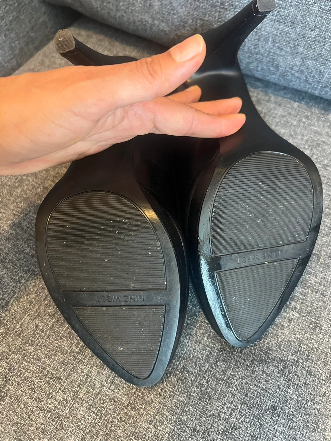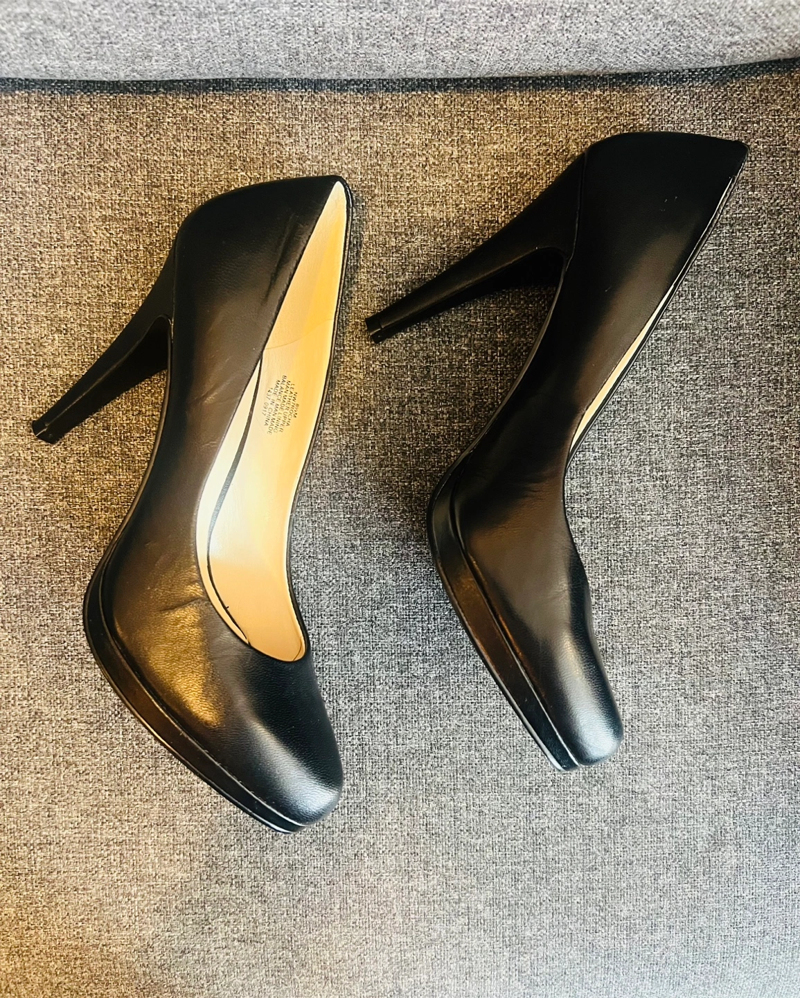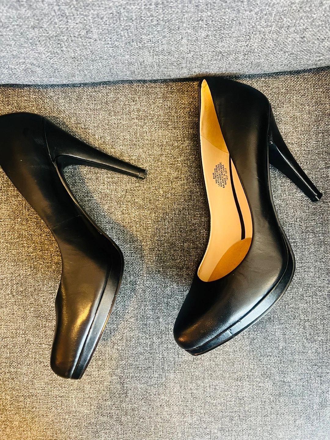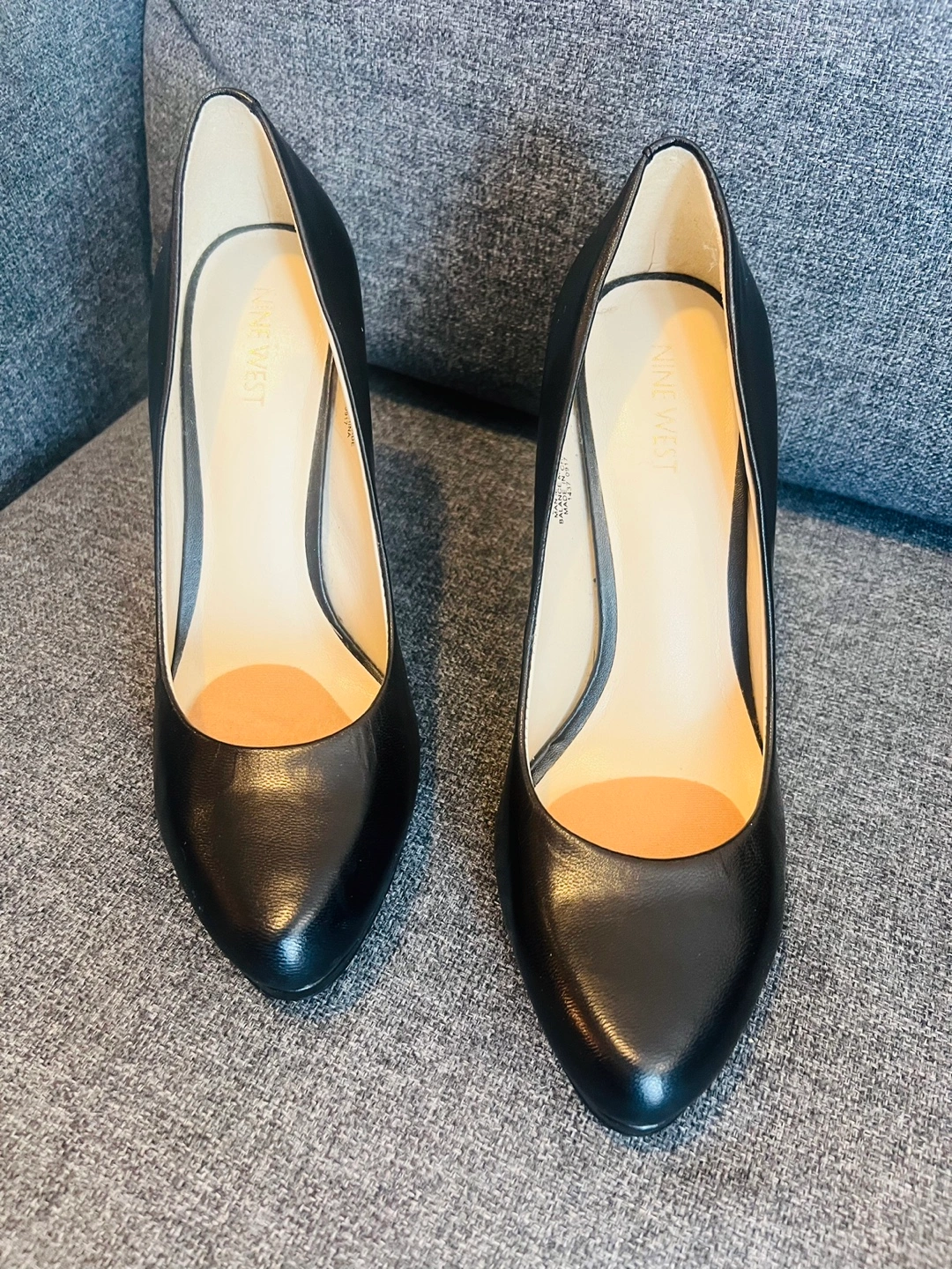 Pair of black lNine West high heels. Classic pump style. Slight platform. Good for the office or going out.
