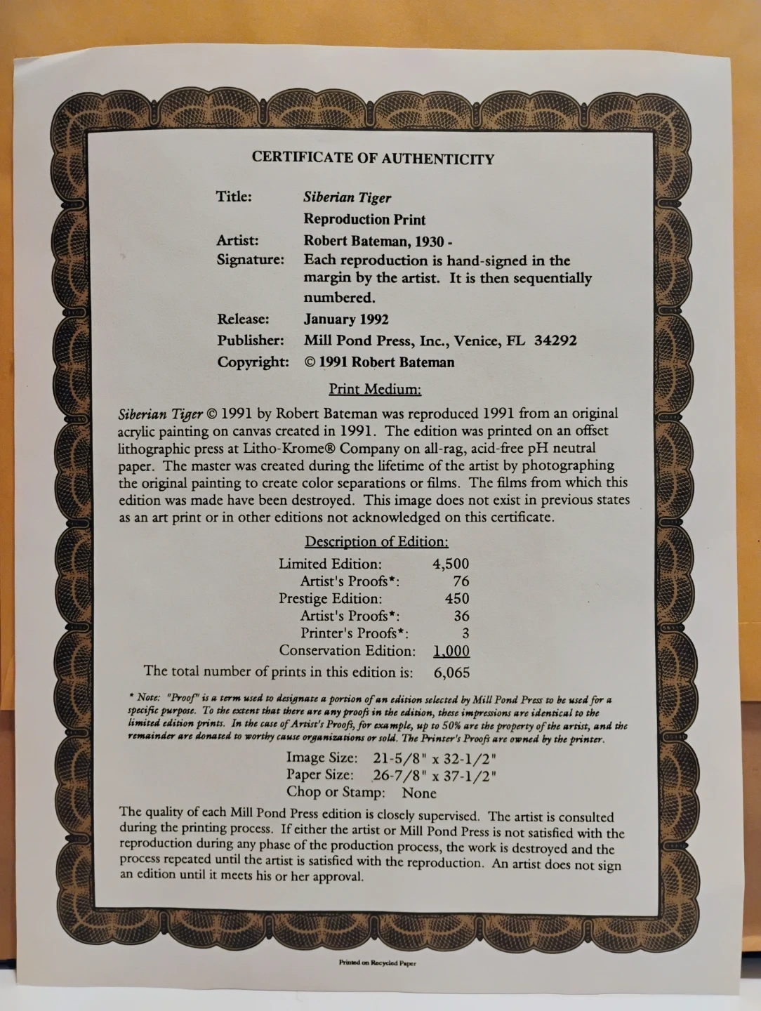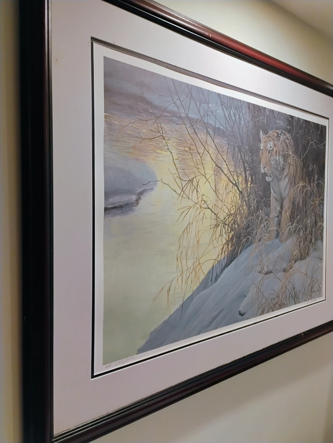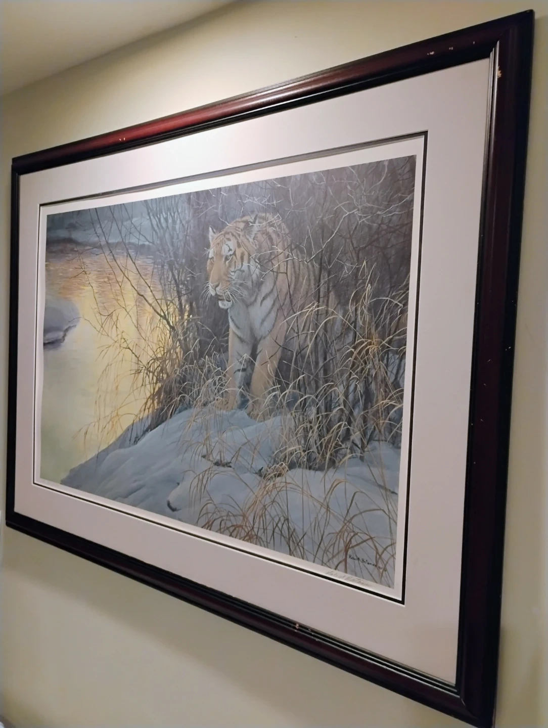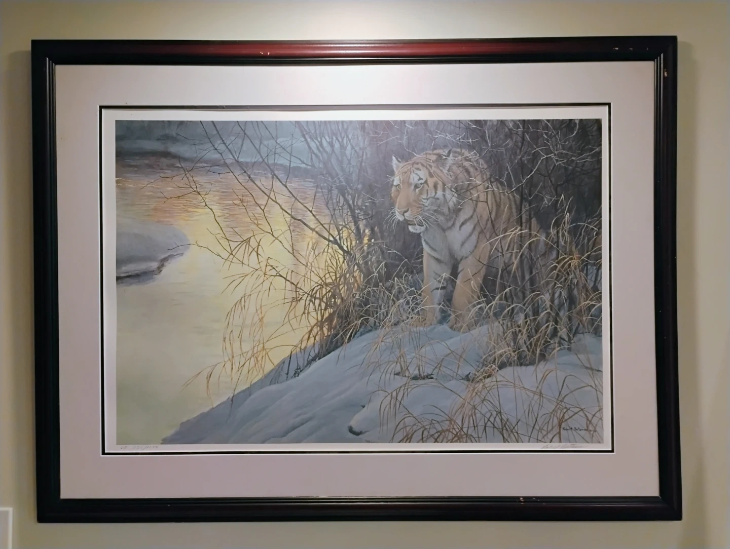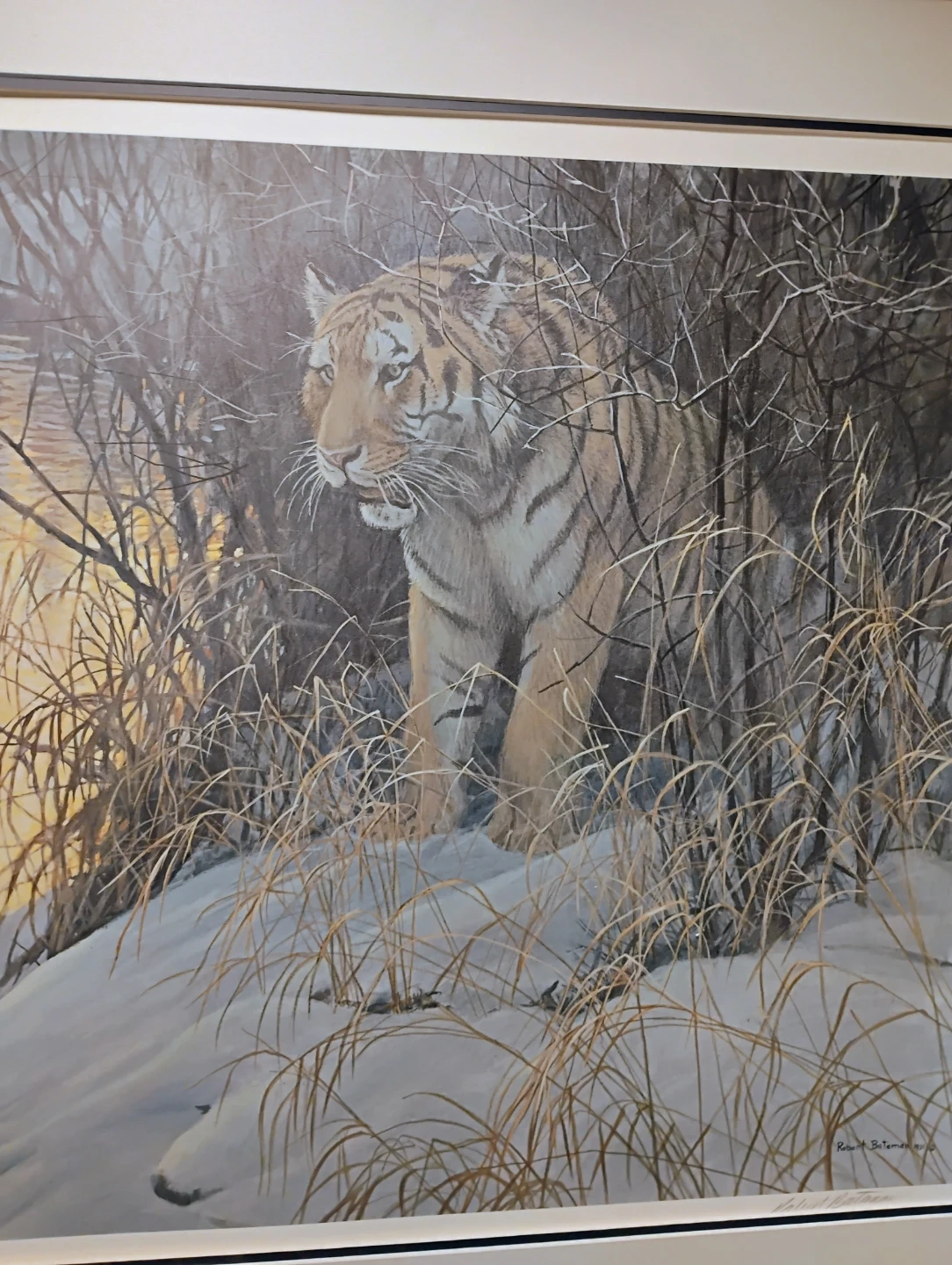 This is a limited edition print by Robert Bateman, titled "Tiger in Winter". It's number 355 of 1000. The print was created in 1991 and is signed by the artist. It's framed and ready to hang. Used, ok condition needs some touch up. Asking $250 or best offer.
