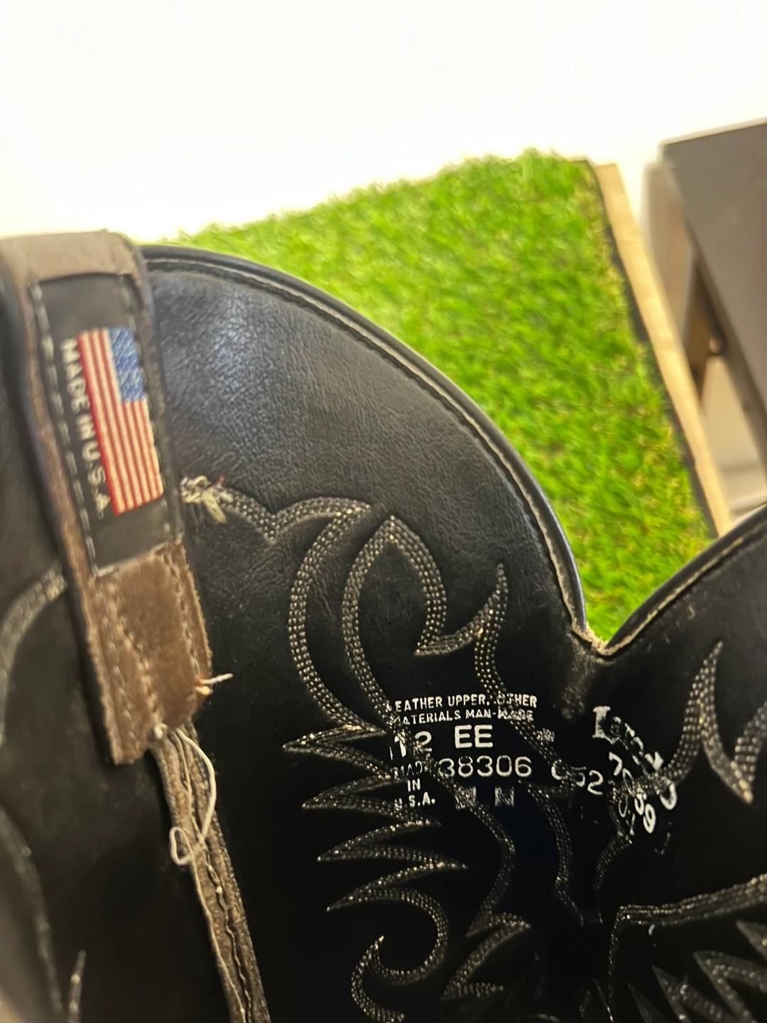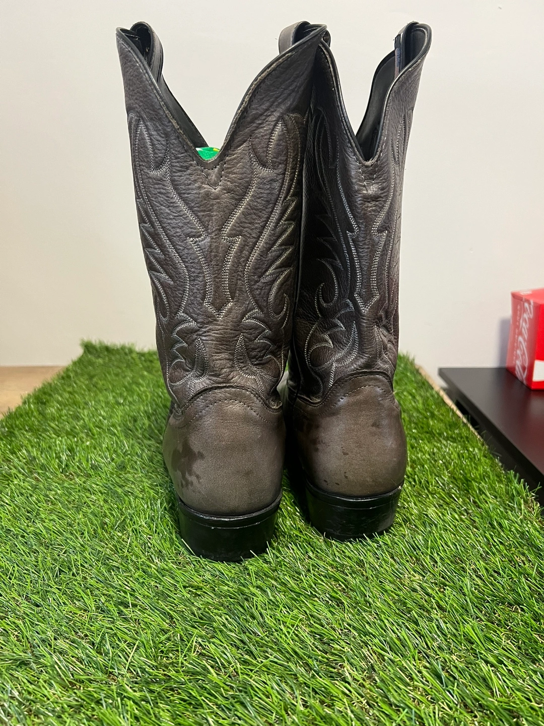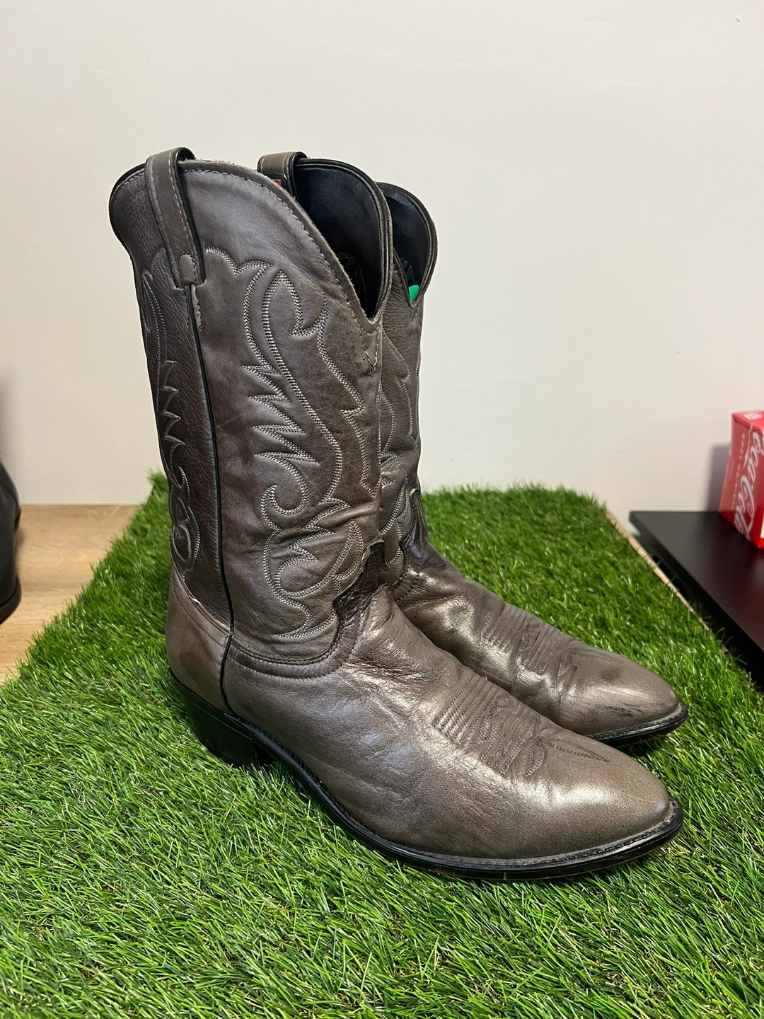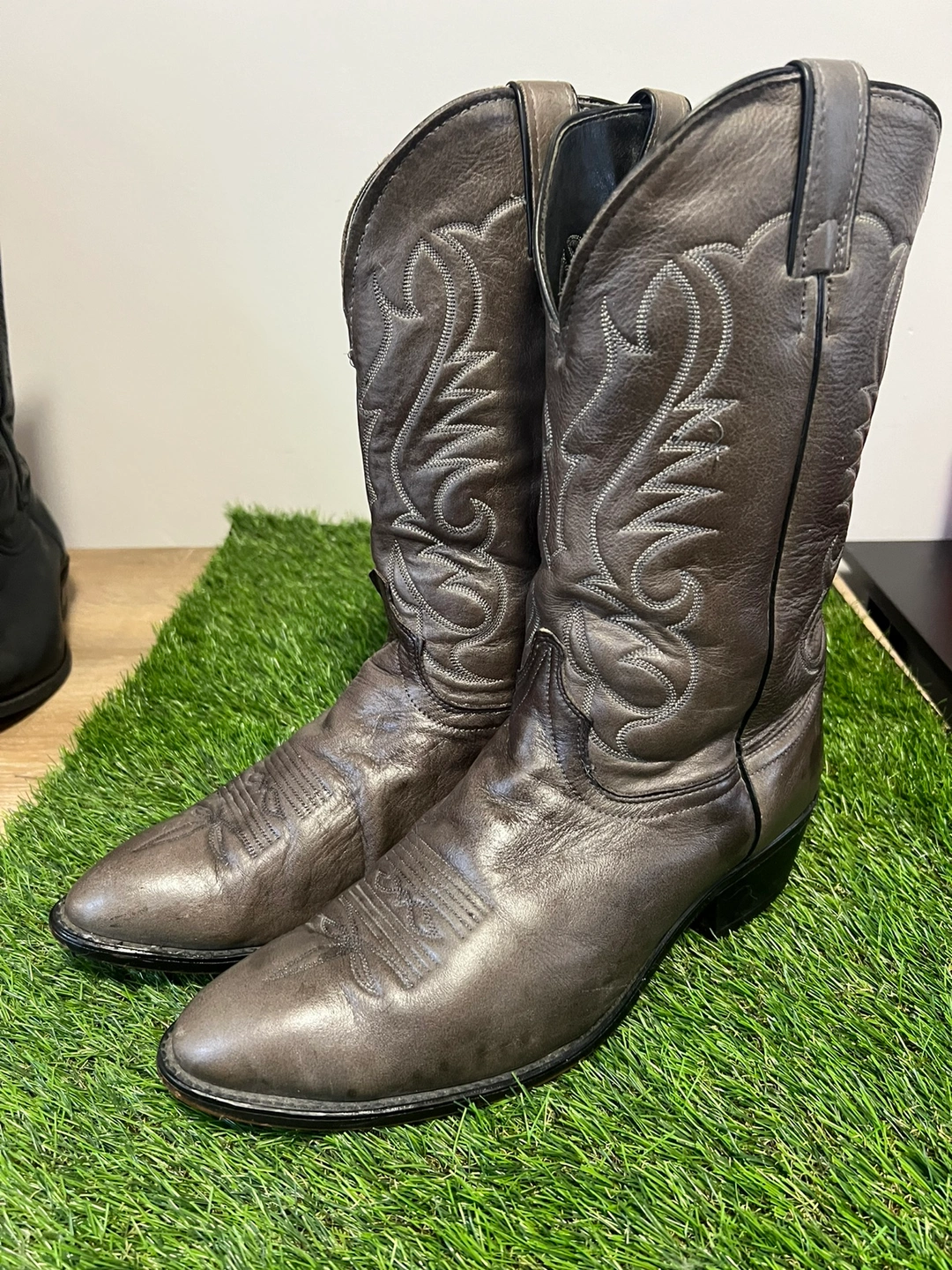 Grey leather cowboy boots. Size 12 EE. Made in the U.S.A. Features intricate stitching. Good condition.