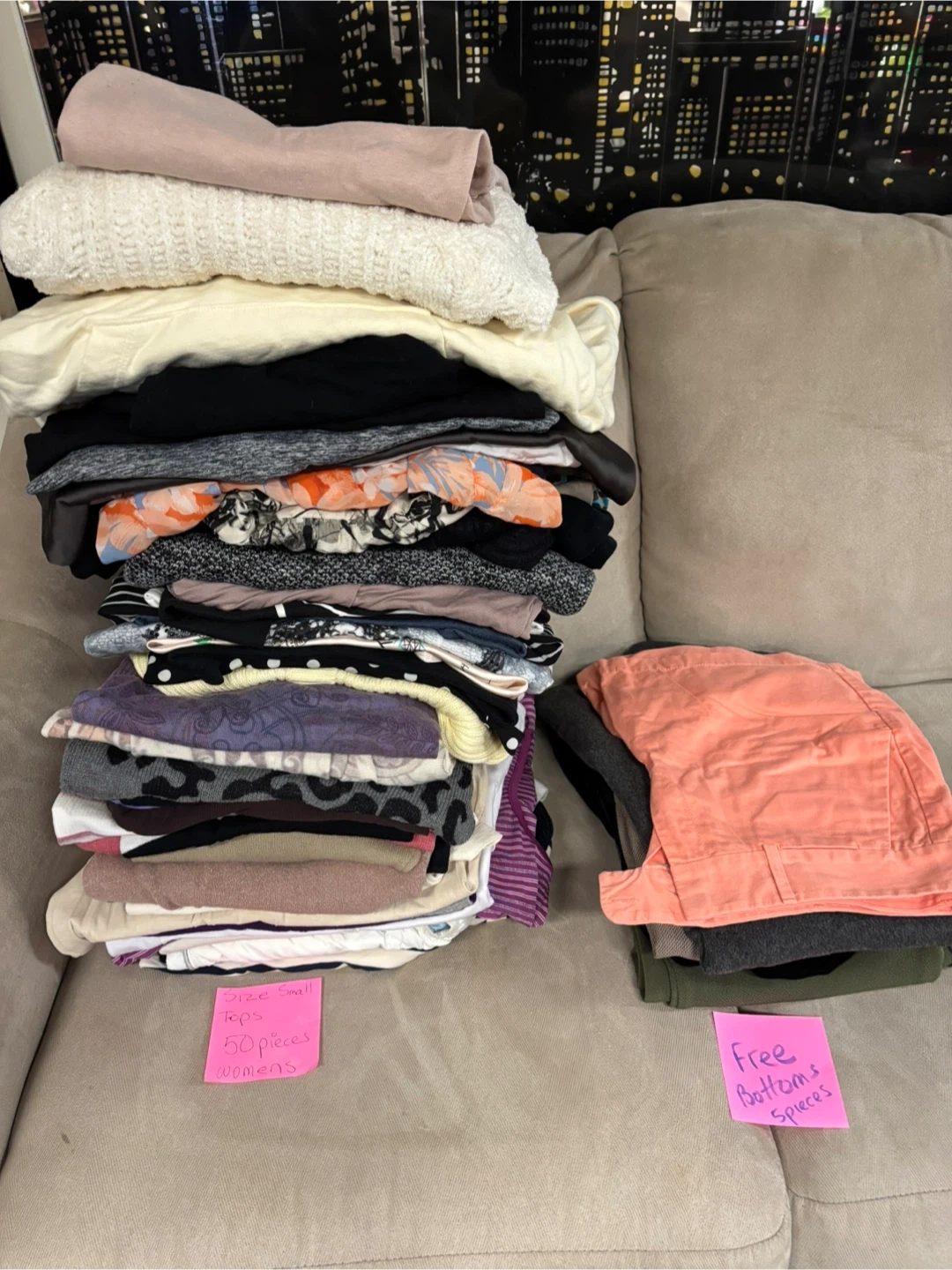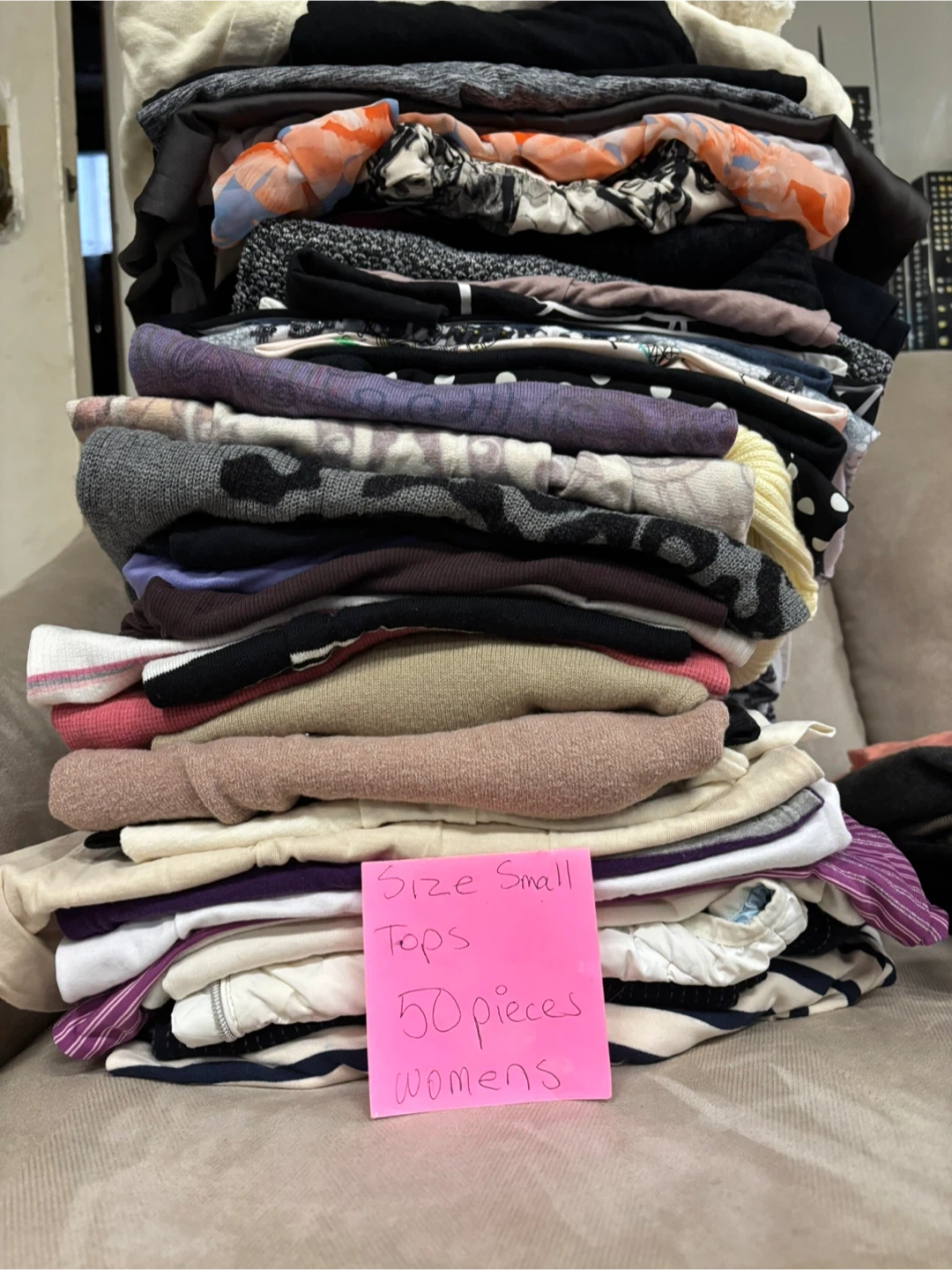 Bundle of 50 women's tops in size small. Includes various styles and colors. Also includes 5 free bottoms pieces. Great for refreshing your wardrobe!