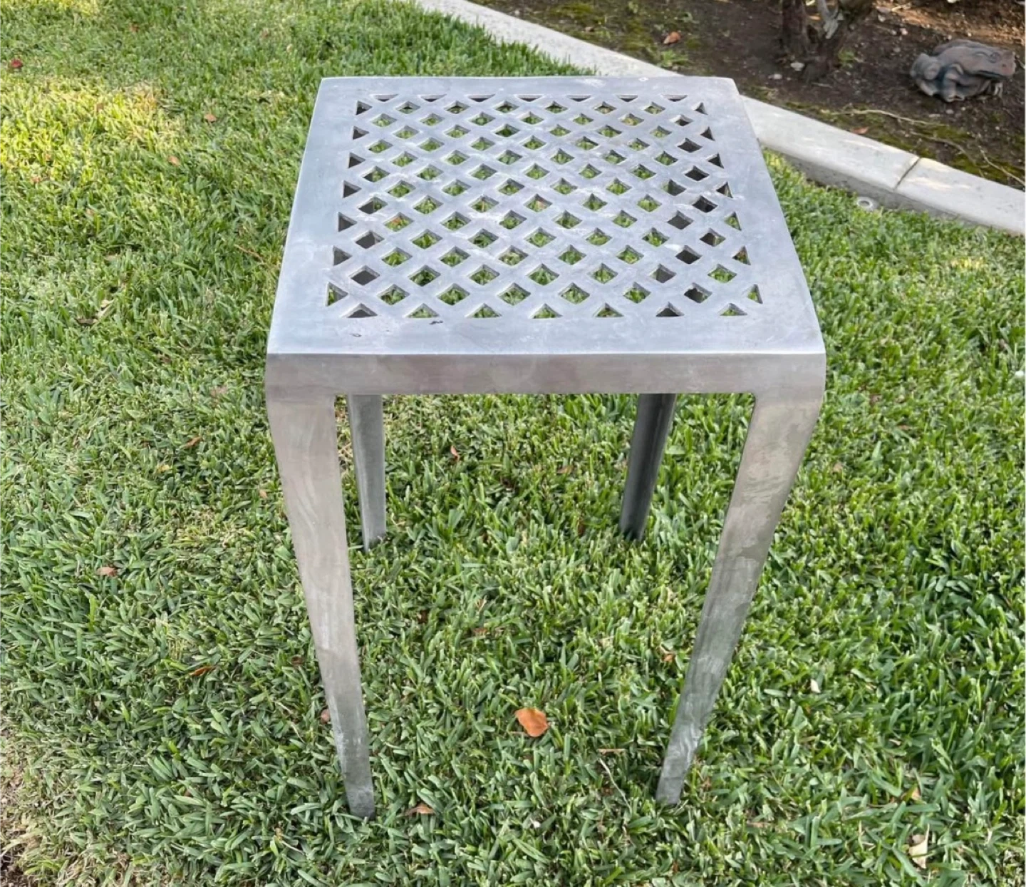 This is a metal side table with a decorative lattice top. It's made of aluminum, perfect for outdoor use. Its simple design makes it a versatile accent piece.