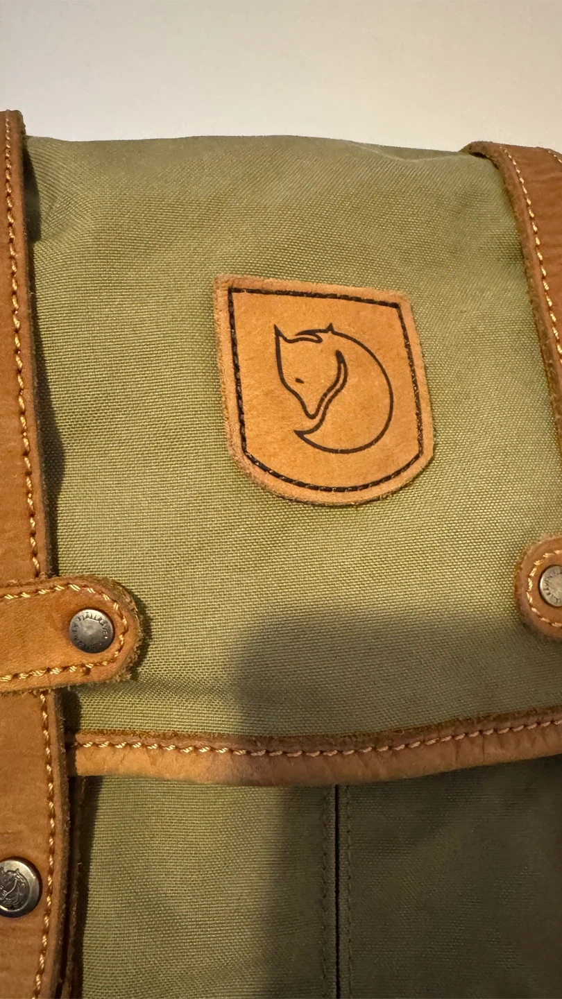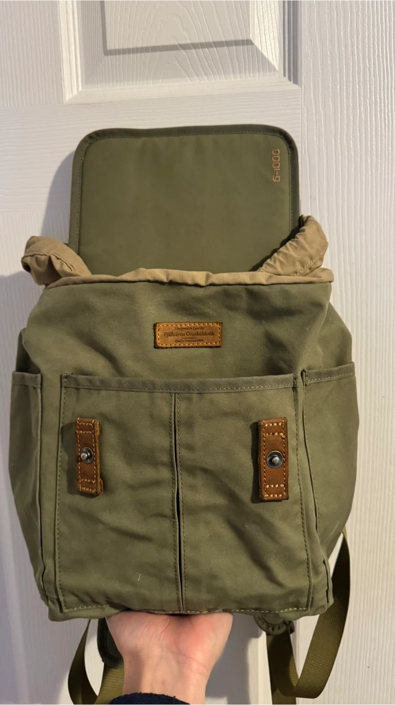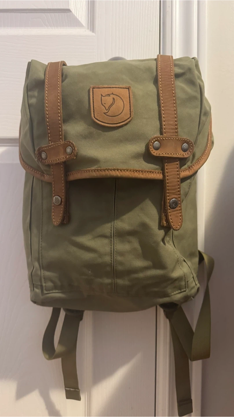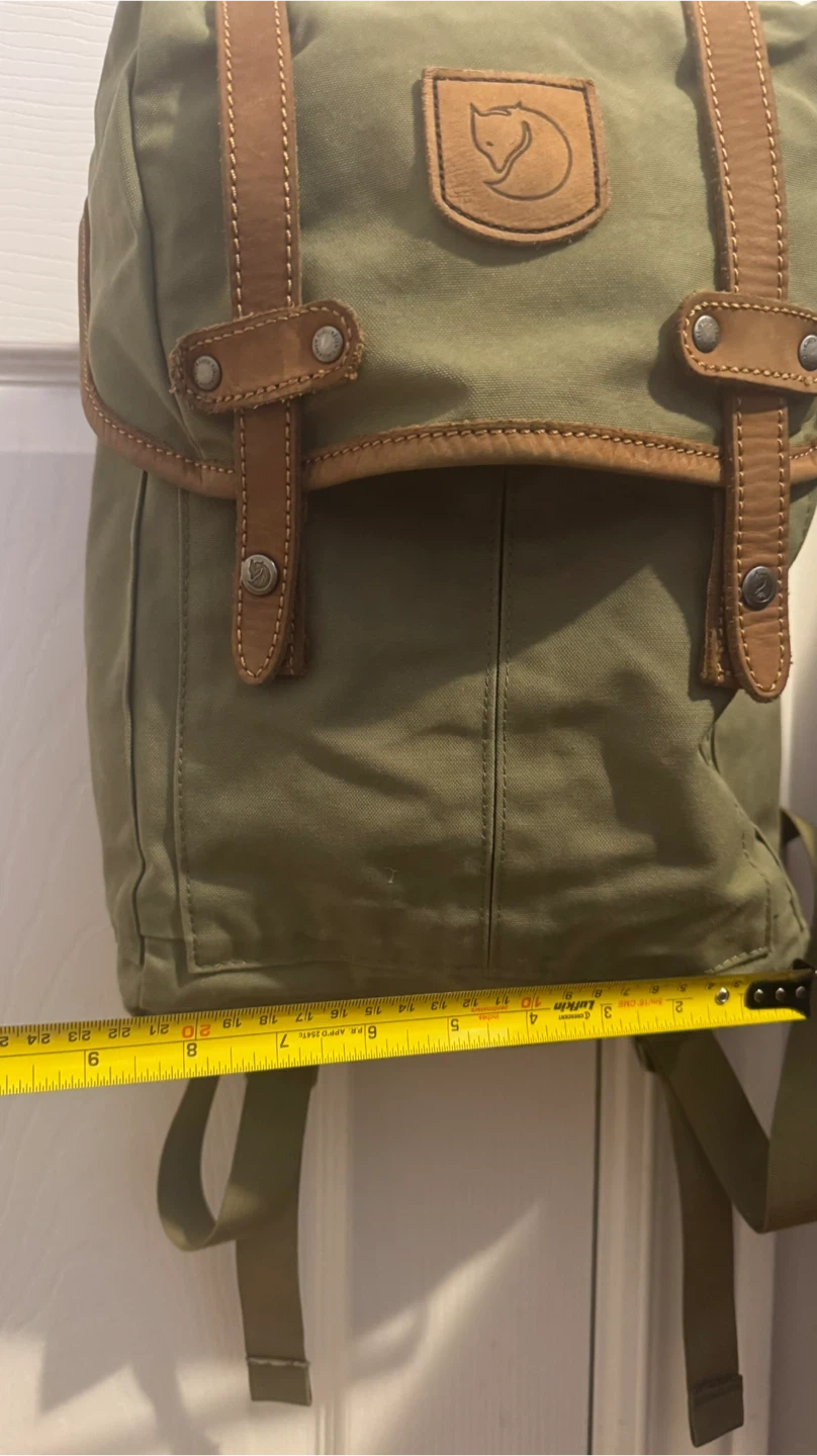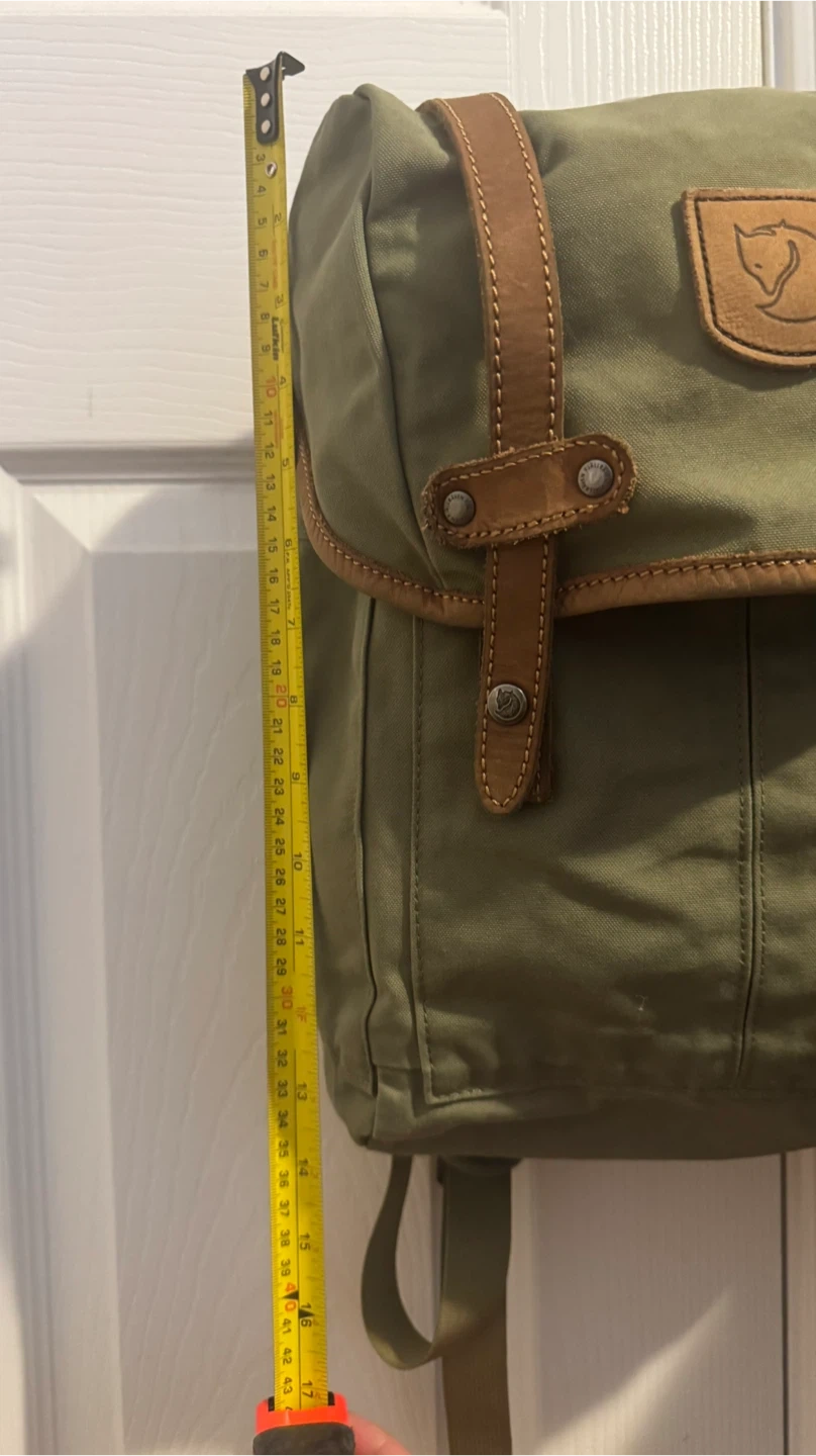 This is a green Fjällräven rucksack No.21.backpack mini. It's made from durable G-1000 HeavyDuty Eco S material with leather details. The dimensions are approximately 14 inches tall and 7 inches wide. This pack is perfect for everyday use or light hiking trips!